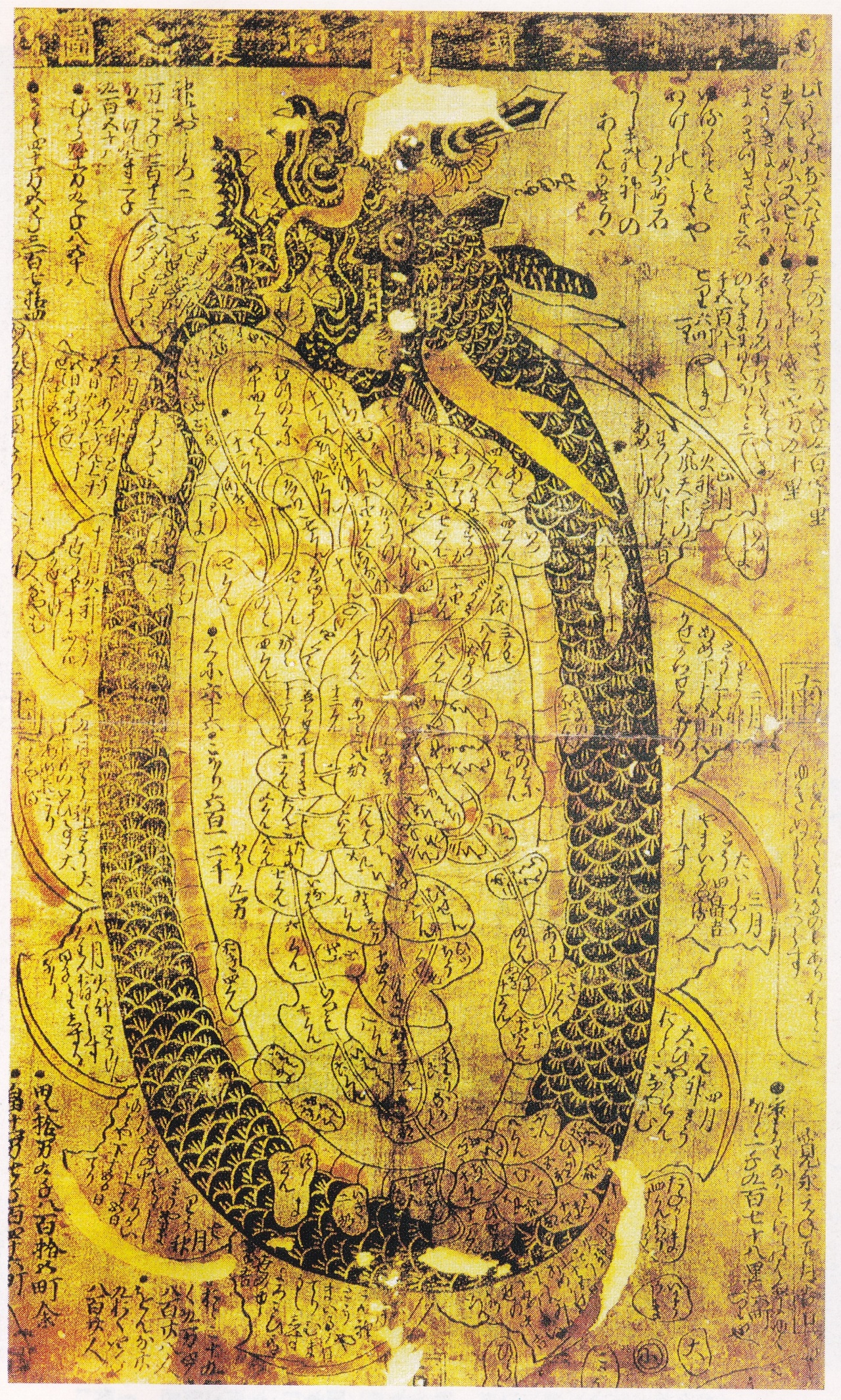 야요이 시대중국으로부터 현재의 용 모티프가 일본에 전해졌다. 이즈미시 이케가미 소네 유적에서 기원 1세기경 몸통을 꼬고 삼각형 돌기를 가진 동물이 그려진 항아리가 출토되었다. 이러한 야요이 용 도안 유물은 일본 전국에서 30점 정도 발견되었다. 당시 일본인은 용에 대한 확고한 이미지가 없어 중국 용을 정확하게 모방할 수 없었다. 한편, 최초의 야요이인은 강남 지역 용사 신앙을 가진 해신족의 흐름이라는 설[7]이 있으며, 대륙에서 용과 함께 건너왔다고 여겨진다. 『위지왜인전』에는 인이 문신으로 교룡을 피하는 풍습과 비슷하게, 왜인도 문신으로 대어수금의 재앙을 피한다고 기록되어 있다.