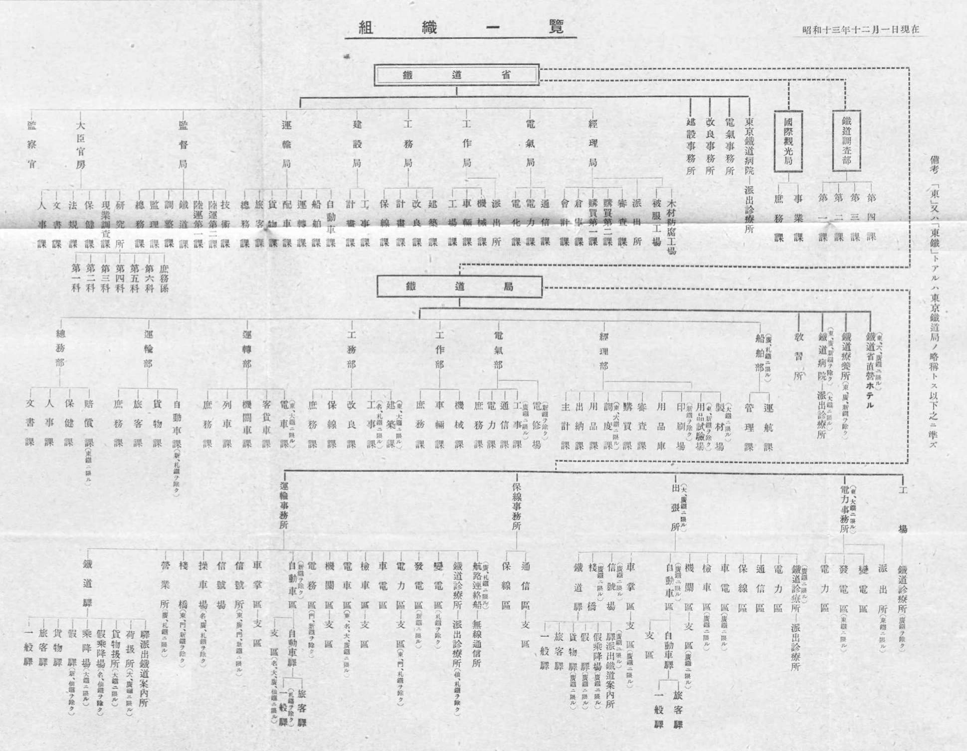철도국은 철도원 철도관리국을 계승하여 삿포로, 센다이, 도쿄, 나고야, 고베(1928년 5월 오사카 철도국으로 개칭, 오사카로 이전), 모지의 6국 체제로 출발했다. 1935년 히로시마(오사카, 모지에서 분리), 1936년 니가타(센다이, 도쿄에서 분리) 철도국이 신설되었고, 1943년에는 자카타 철도국(자카타청 철도에서 편입)이 발족했다.1927년에는 화물 운송 수요 증가와 복잡한 운임제도, 소규모 운송사업자 난립으로 인한 혼란을 해결하기 위해 철도성 직영으로 철도와 민간 운송업자가 협력하여 운송하는 체계를 만들고, 각지의 철도국, 운송점, 상공 관계자가 참여하는 '운수위원회'를 전국 37곳에 설치했다. 1935년에는 전국의 운수위원회가 군부가 참여한 철도국별 '교통협의회'로 개편되어 각 지역의 육상교통 통제 조직으로 바뀌었다.