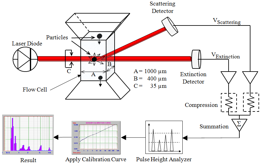 - '''집속 빔 반사 측정''': 집속된 레이저 빔은 일정한 주파수로 회전하며 시료 매질 내의 입자와 상호 작용한다. 각각 무작위로 스캔된 입자는 레이저 빔을 전용 광다이오드로 가리며, 이 광다이오드는 가림 시간을 측정한다. 가림 시간은 알려진 빔 회전 속도에 직접 측정된 가림 시간을 곱하여 입자의 직경을 계산한다(D=V*t).