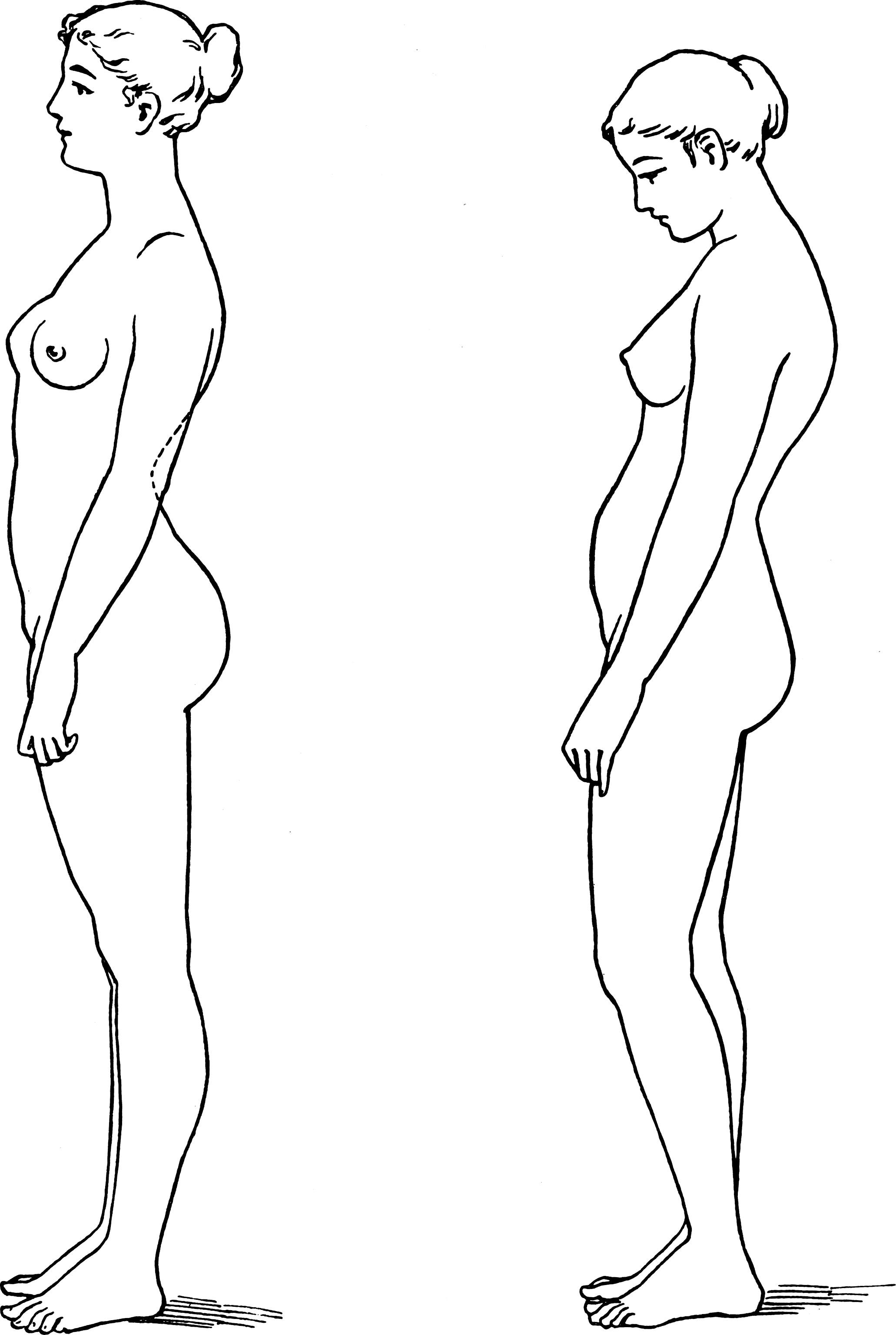 두 가지 다른 자세 비교. 왼쪽은 더 활기찬 태도의 예시이고, 오른쪽은 우울한 태도의 예시이다.