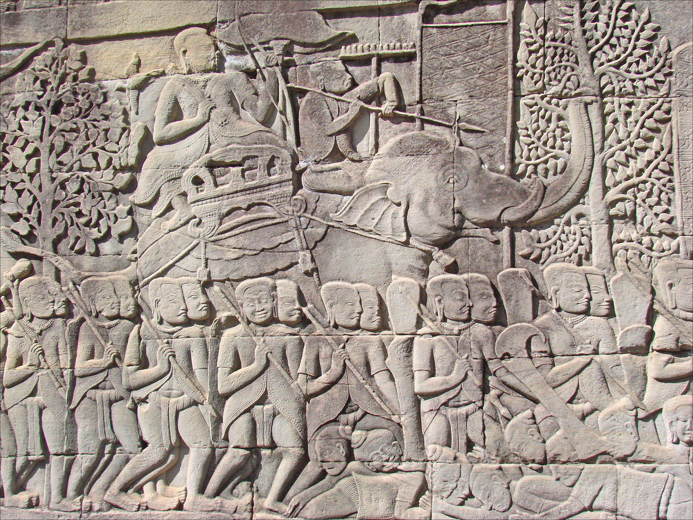 자야바르만 7세가 자신의 "사원 산"으로 건설한 바이욘은 불교와 힌두교의 상징들이 혼합된 다면적이고 다층적인 사원이다.[6] 바이욘의 외벽에는 전쟁뿐만 아니라 크메르 군대와 그 추종자들의 일상생활을 보여주는 놀라운 낮은 부조가 새겨져 있다. 이 부조에는 동물과 소달구지를 몰고 이동하는 수행원들, 사냥꾼들, 요리하는 여성들, 중국 상인들에게 물건을 파는 여성 상인들, 그리고 일반 보병들의 축제 장면 등이 묘사되어 있다. 또한, 이 부조에는 톤레삽 호수에서 벌어진 해전 장면도 묘사되어 있다.[6] 바이욘은 앙코르 예술의 전성기를 상징한다고도 하며,[37] 바이욘에 새겨진 부조에는 참파 왕국과의 전투를 주제로 한 것이 많다.[23]4. 3. 기타 건축물