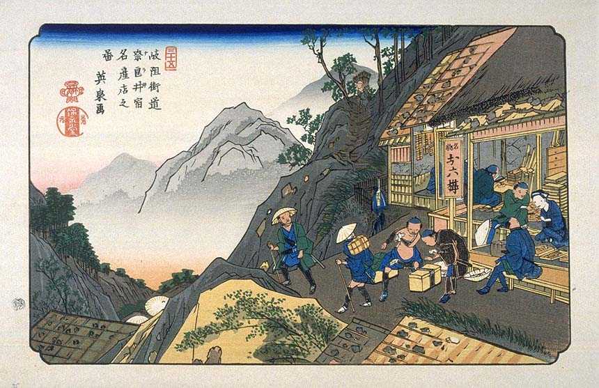 - 6. 「기소 가이도 나라이지쿠 명산점 그림」 :「나라이지쿠」. 게이사이 에이센 그림. 처음에는 고갯길의 험난함 때문에 절실히 요구되었던 립바 찻집이었을 터인데, 가게로서 꽤나 번성해 보인다.