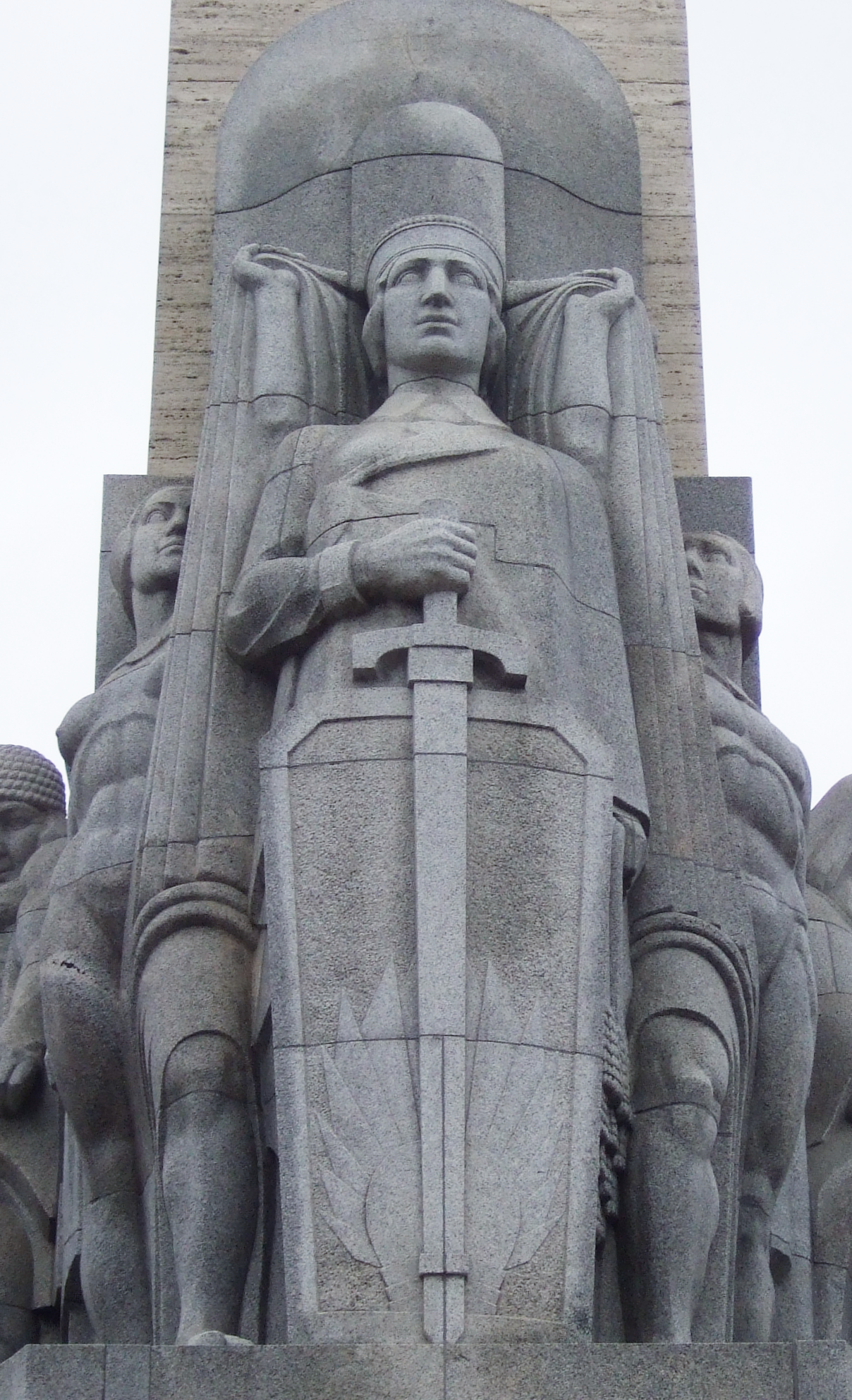 붉은 화강암 기단 위에는 높이와 너비가 6m, 길이가 7.5m인 또 다른 직사각형 블록이 놓여 있다. 이 블록은 높이 5.5m에서 6m 사이의 회색 화강암 조각 그룹 네 개로 둘러싸여 있다. 이들은 각각 '라트비아'(2; Latvijalv), 라트비아 서사시의 민간 영웅인 '라치플레시스'(3; Lāčplēsislv), 발트 "이교도" 사제인 '바이델로티스'(5; Vaidelotislv), 그리고 쇠사슬에서 벗어나려는 세 남자를 묘사한 '족쇄 파괴자'(4; Važu rāvējilv)이다.[24][56]