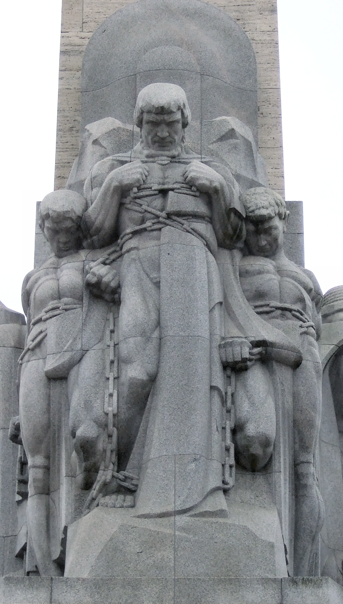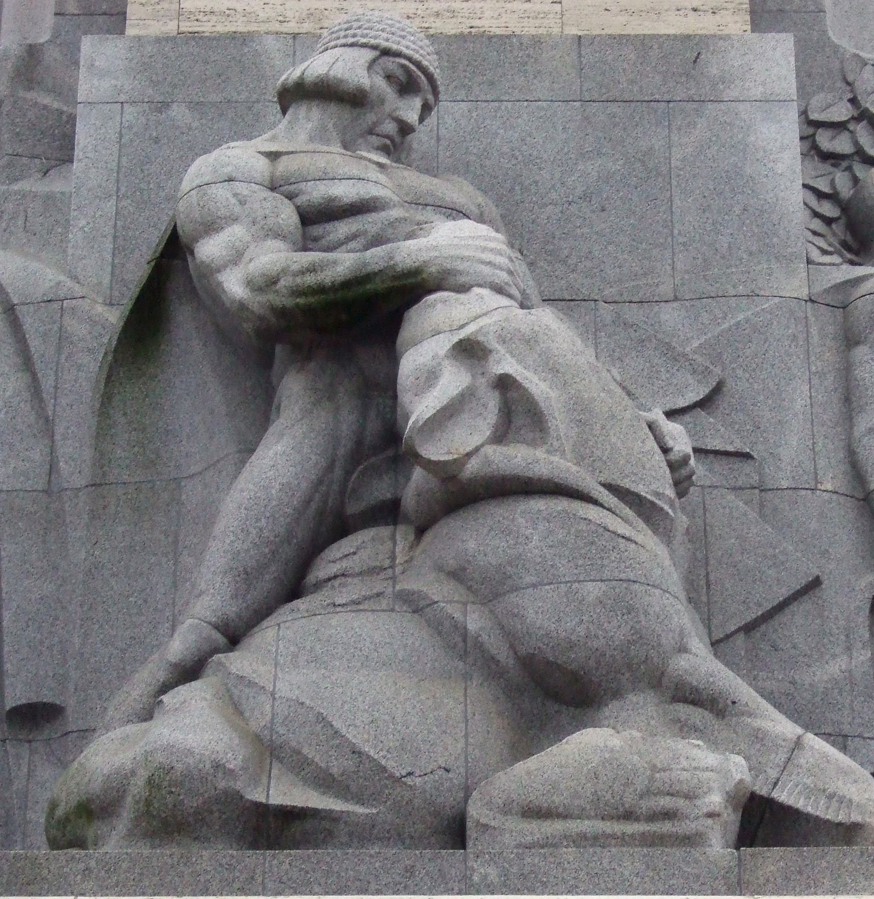 붉은 화강암 기단 위에는 높이와 너비가 각각 6m, 길이가 7.5m인 또 다른 직사각형 블록이 놓여 있다. 이 블록은 5.5m에서 6m 높이의 회색 화강암으로 만들어진 네 개의 조각 그룹으로 둘러싸여 있다. 이들은 '라트비아'(2; Latvijalav), 라트비아의 서사시적 민간 영웅인 '라치플레시스'(3; Lāčplēsislav), 발트 이교도 사제인 '바이델로티스'(5; Vaidelotislav), 그리고 쇠사슬에서 벗어나려는 세 남자를 묘사한 '족쇄 파괴자'(또는 해방자)(4; Važu rāvējilav)이다.[24][56]