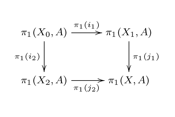 위상 공간 ''X''가 두 부분 공간 ''X''1, ''X''2의 내부로 덮여 있고, ''A''가 ''X''1, ''X''2 및 ''X''0 = ''X''1 ∩ ''X''2의 각 경로 성분을 만나는 집합이라고 할 때, ''A''는 ''X''의 각 경로 성분을 만나고, 포함에 의해 유도된 사상의 다이어그램 '''P'''는 군군의 범주에서 푸시 아웃 다이어그램이다.[4]