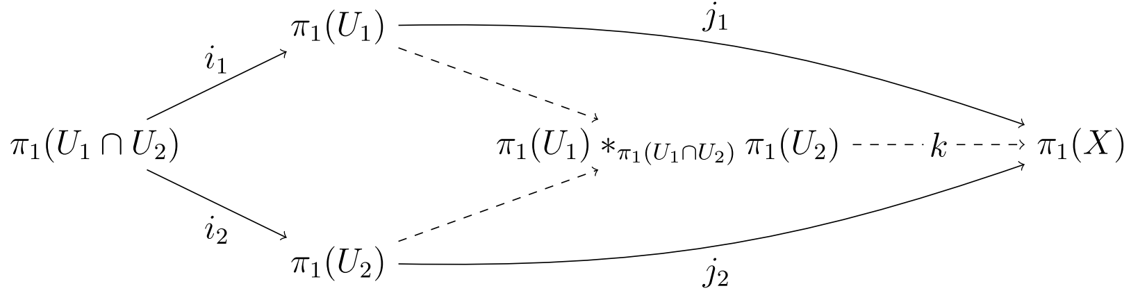 자연 사상 ''k''는 동형 사상이다. 즉, ''X''의 기본군은 의 합병과 함께 ''U''1과 ''U''2의 기본군의 자유곱이다.[1]