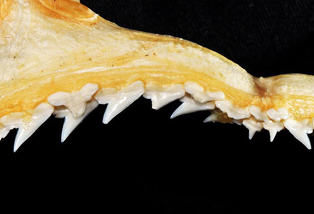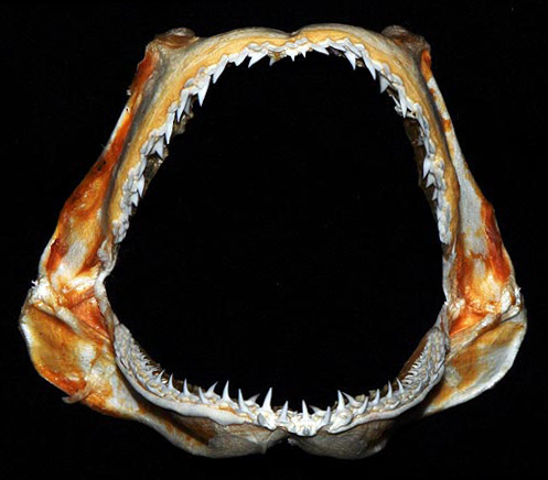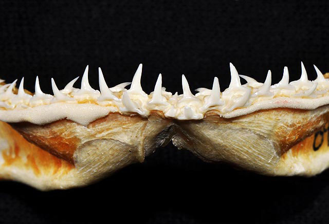 입은 강하게 굽어 있는 형태이다. 양턱에는 총 30~32개의 이빨이 있으며, 한쪽 치열을 기준으로 위턱에는 15~16개, 아래턱에는 15~17개의 이빨이 있다. 각 이빨은 매끄럽거나 약하게 톱니 모양의 가장자리를 가진 단일하고 좁은 첨두(cusp)를 가지고 있다. 위턱의 이빨은 비스듬하게 기울어져 있는 반면, 아래턱의 이빨은 똑바로 서 있다.