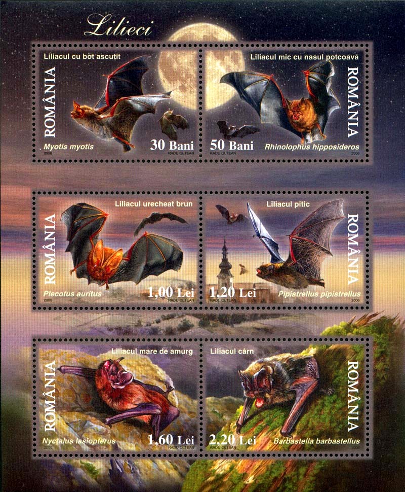 2003년 루마니아 우표 시리즈. 위에서 아래로, 왼쪽에서 오른쪽 순서로 큰귀박쥐, 작은쇠신박쥐, 갈색긴귀박쥐, 집박쥐, 큰황금박쥐, 검은집박쥐가 묘사되어 있다.