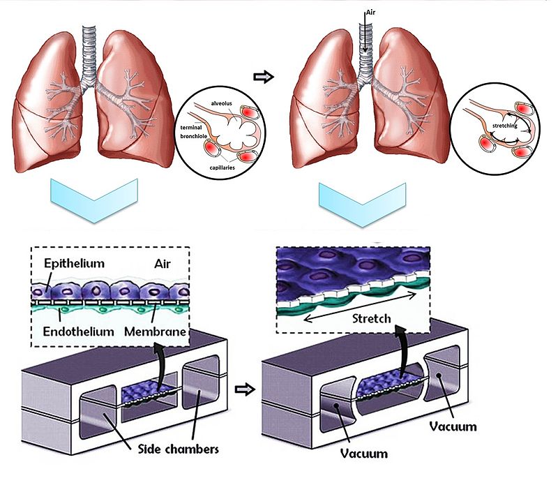 칩의 작동 원리는 다음과 같다. 먼저, 칩 위에 전자회로를 설치하고, 특정 구역에는 폐 세포를, 다른 구역에는 모세혈관 세포를 배양한다. 폐 세포가 있는 구역에는 진공펌프를 이용하여 물리적으로 팽창과 수축 운동을 반복하게 함으로써 실제 사람의 호흡 운동을 모사한다. 동시에 모세혈관 세포가 있는 구역에는 혈액과 유사한 성분의 배양액을 흘려보내, 실제 혈액처럼 산소를 공급하고 영양분과 노폐물을 교환하는 기능을 모방한다.[130][131]