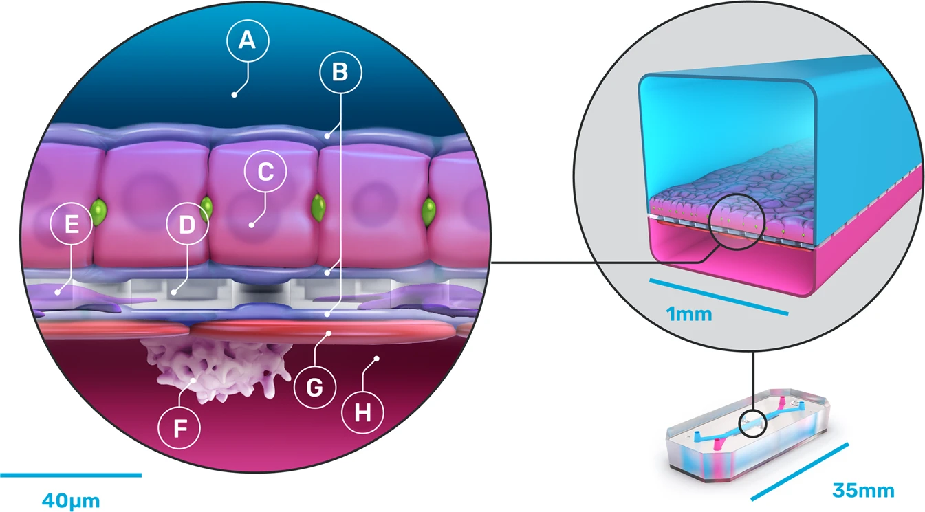 기존의 2차원(2D) 또는 3차원(3D) 세포 배양 시스템은 실제 장기의 복잡한 환경, 특히 조직 간 경계면, 화학 물질의 시공간적 기울기, 기계적으로 활발한 미세 환경 등을 완전히 모방하기 어려웠다.[6] 장기 칩 기술은 이러한 한계를 극복하며, 살아있는 장기의 생물학적 활동, 동적 기계적 특성, 생화학적 기능을 모방하는 차세대 3D 세포 배양 모델로 주목받고 있다.[7]인간의 장을 모사한 장기 칩은 주로 폴리디메틸실록산(PDMS)으로 제작된 두 개의 마이크로 채널을 포함하며, 이 채널들은 유연한 다공성 세포 외 기질(ECM) 막으로 분리된다. 이 막 위에는 장 상피 세포가 배양되는데, 인간 결장 선암종에서 유래하여 장의 보호 및 흡수 특성을 나타내는 Caco-2가 널리 사용된다.[27][28]