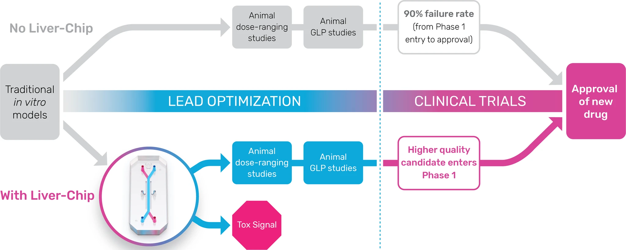 이러한 장기 칩 기술은 인간의 생리적 반응을 더 정확하게 모사하면서도 비용을 절감하고 실험 과정을 효율화할 수 있다. 특히, MEMS 기반의 바이오칩은 복잡한 장기 수준의 병리학적 반응을 재현하여 독성학, 의약품 및 화장품 개발 과정에 혁신을 가져올 잠재력을 지닌다.[109] 또한, PBPK 모델과 결합하여 약물의 흡수, 분포, 대사, 배설(ADME) 과정을 더욱 신뢰성 있게 예측하고, 약물의 효과와 독성을 시험관 내에서 연구하는 데 유용하게 활용될 수 있다.[110] 장기 칩은 인간 세포를 사용하므로 동물 실험 결과를 인간에게 적용할 때 발생하는 불확실성을 줄이고, 임상 시험의 성공률을 높이는 데 기여할 수 있다. 나아가 사람을 대상으로 하는 임상 시험의 일부 절차를 대체하여 신약 개발에 드는 막대한 비용과 시간을 단축할 가능성도 제시된다.[134]