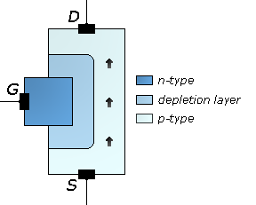 '''n채널''' "공핍형" 소자는 음의 게이트-소스 전압으로 공핍 영역을 넓혀 채널을 좁힌다. 핀치오프 전압에서 채널이 닫히면 FET는 꺼진다. 양의 게이트-소스 전압은 채널을 넓혀 전자가 쉽게 흐르게 한다.