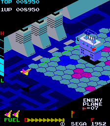 게임의 목표는 플레이어의 우주선이 격추당하거나 연료가 떨어지지 않으면서 가능한 한 많은 표적을 맞추는 것이다. 연료는 맵 곳곳에 있는 연료 드럼을 파괴하여 보충할 수 있으며, 파괴 시 300점을 얻는다.[7] 이는 코나미의 스크램블과 유사한 시스템으로[52], 연료 게이지(최대 16칸)가 3칸 이하로 남으면 경고음이 울린다. 스테이지마다 연료 소모율(연비)이 다르기 때문에[53], 연료가 부족할 때 연료 드럼을 하나만 파괴해서는 회복이 충분하지 않을 수도 있다.