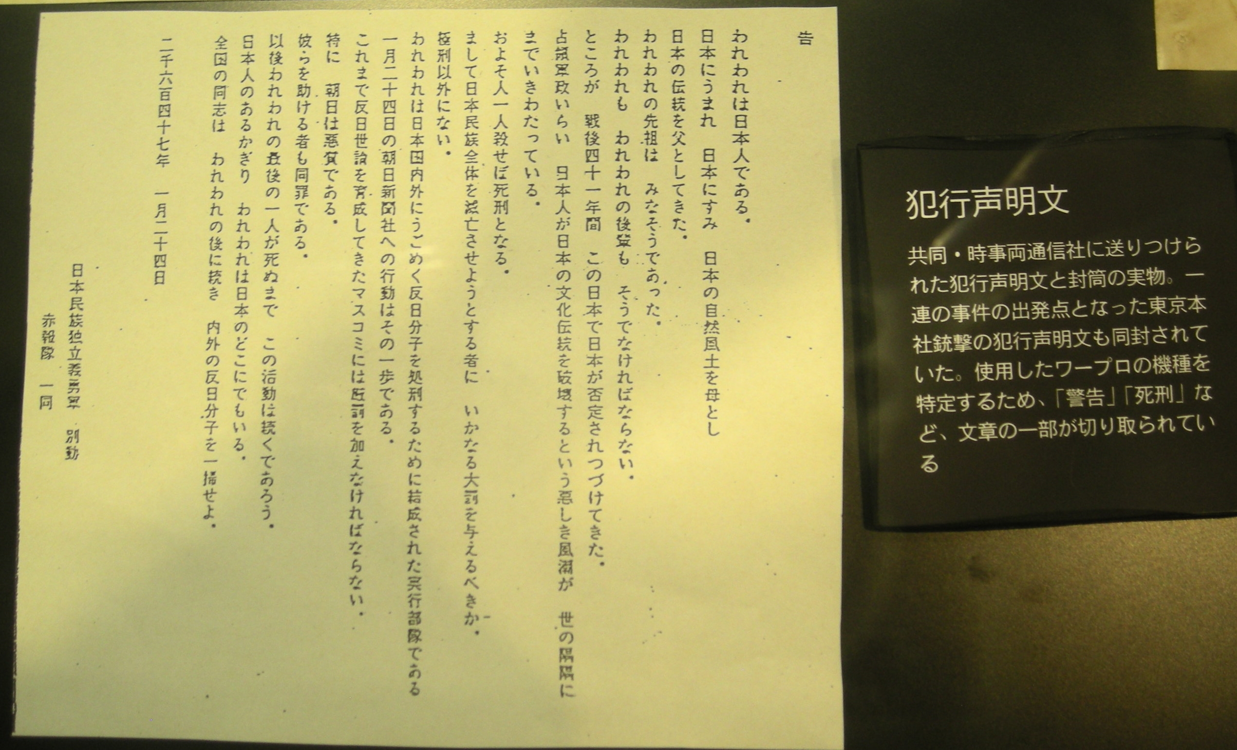 범행 성명에서, 범인은 자신들을 "일본 국내외에서 움직이는 반일 분자를 처형하기 위해 결성된 실행 부대"라고 칭하며, "반일 여론을 육성해 온 언론에는 엄벌을 가해야 한다", "1월 24일의 아사히 신문사에 대한 행동은 그 첫걸음이다", "특히 아사히는 악질적이다"라고 아사히 신문에 격렬한 적의와 원한을 나타내고, 언론을 표적으로 한 테러의 지속을 시사하는 내용을 담고 있었다.