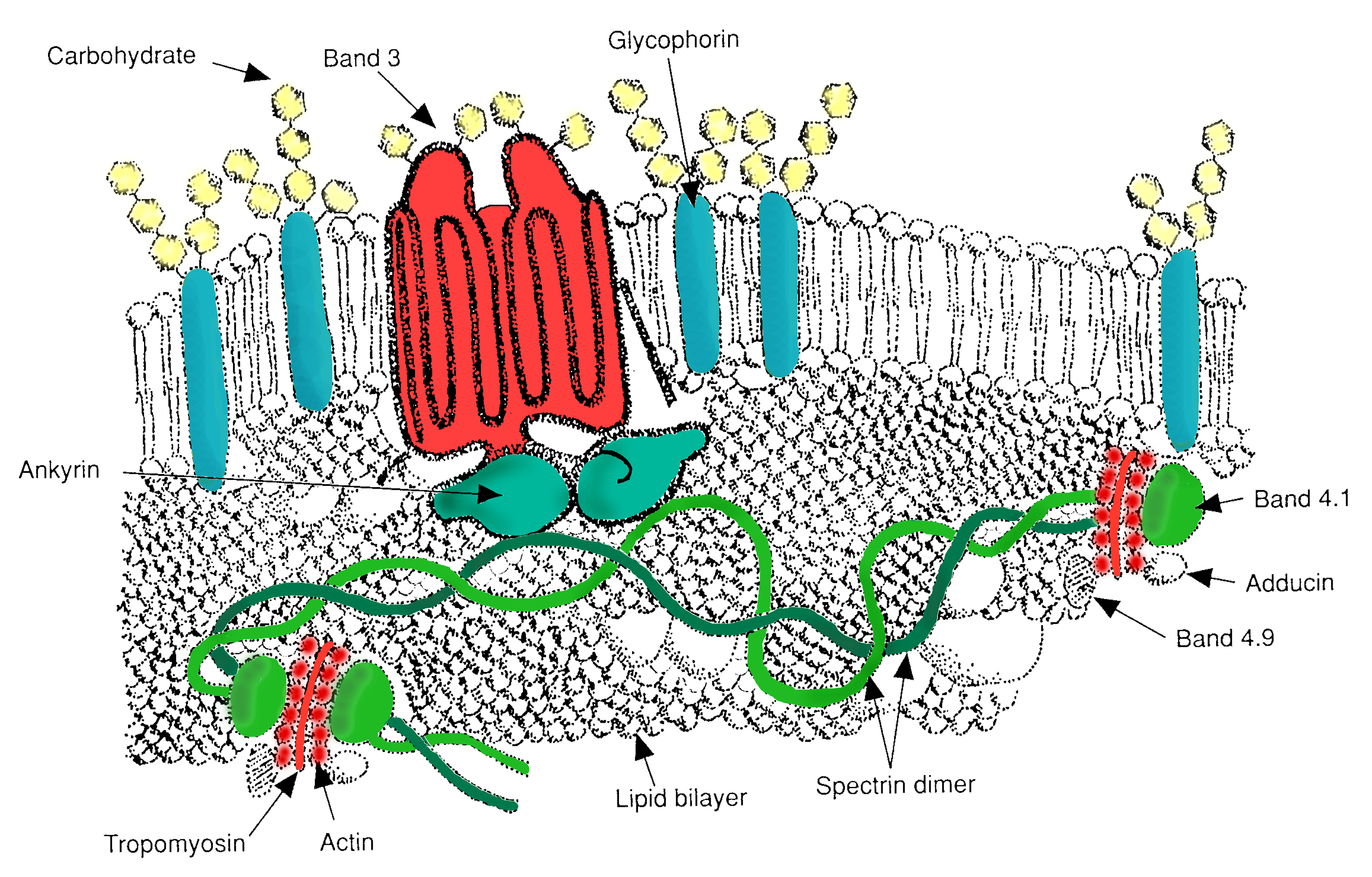 적혈구는 유연성과 안정성이 필요하며, 이를 위해 적혈구 세포막은 막 지질 이중층, 막 골격, 막 관통 단백질 등으로 구성되어 있다.