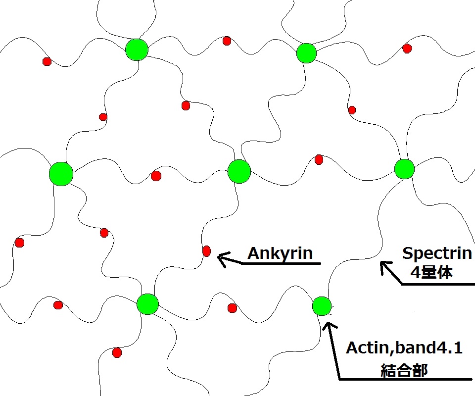 α 사슬 스펙트린(Spectrin)과 β 사슬 스펙트린이 연결된 한 개의 선형 단백질이 나란히 2개가 얽힌 길이 200nm의 끈 모양 단백질(α 사슬 2개, β 사슬 2개로 이루어진 4량체 스펙트린)이 단백질 4.1, 액틴(Actin) 등의[94] 단백질에 의해 연결되어 망상으로 존재하며 지질 이중층에 접하는 형태로 존재하는 것이 막 골격이다. 스펙트린은 수축성이 풍부하여 펴지면 4량체에서 200nm의 길이가 평소에는 스프링처럼 40nm 정도로 수축하며, 그 수축된 스펙트린이 망상으로 연결된 막 골격은 앙키린(Ankyrin)이나 단백질 4.1에 의해 막 관통 단백질인 밴드 3 단백질이나 글리코포린(Glycophorin)에 결합되어 지질 이중층에 매달린 채 접해있다.