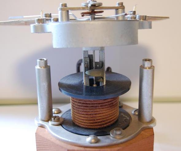 이 그림은 개념적인 것이다. 실제 계기에서는 철심이 고정되어 있으며, 앞뒤 나선형 스프링이 코일로 전류를 전달하고, 코일은 직사각형 밥빈에 지지된다. 또한, 영구 자석의 극은 원의 호이다.