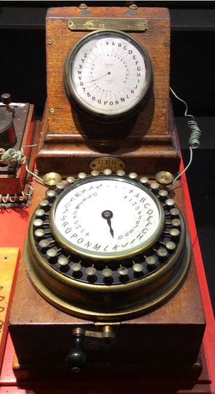 전신 기술은 통신 속도와 효율성을 높이기 위해 꾸준히 발전해왔다. 1846년, 알렉산더 베인은 화학 전신기를 특허받아 자동 기록 기능을 구현했다.[48] 1855년, 데이비드 에드워드 휴즈는 인쇄 전신기를 발명하여 수신된 메시지를 자동으로 인쇄할 수 있게 했다.[53] 이 전신기는 알파벳 26자 키보드와, 이전 전송 이후 경과된 시간에 따라 전송되는 문자를 결정하는 회전하는 타이프 휠을 사용했다.