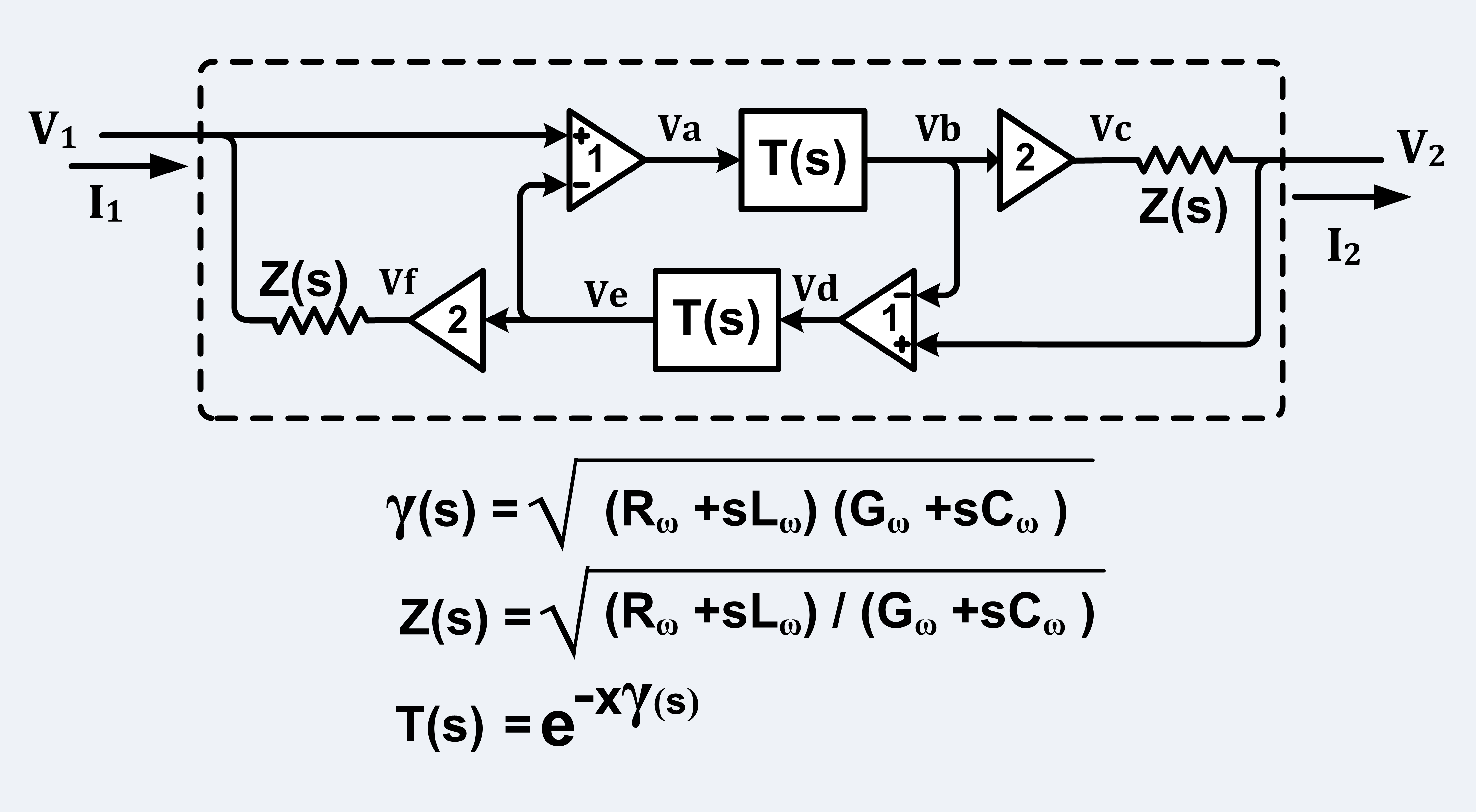 불균형 전송선(동축 케이블 등)의 등가 회로. 여기서 는 전압 제어 전류원(VCCS)의 전달 어드미턴스, 는 전송선의 길이, 는 특성 임피던스, 는 전파 함수, 는 전파 "상수", 이며, 이다.