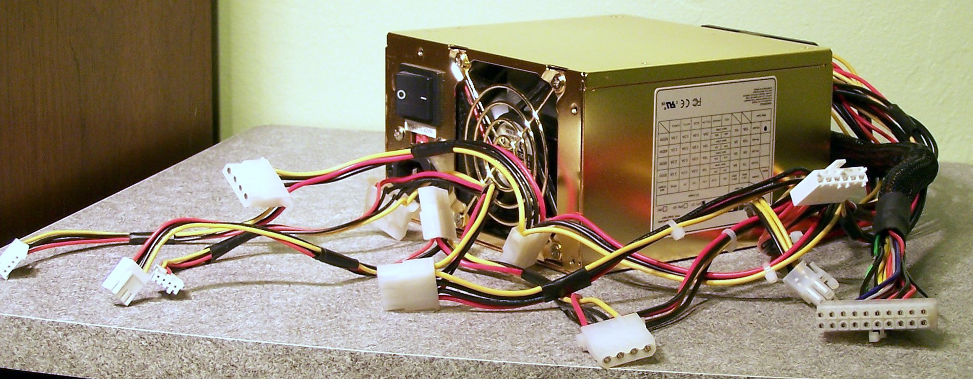 대부분의 데스크톱 PC 전원 공급 장치는 사각형 금속 상자 형태이며, 한쪽 끝에서 굵은 전선 묶음이 나온다.[27] 전원 공급 장치 뒷면에는 통풍구와 IEC 60320 C14 커넥터가 있으며, 전원 스위치나 전압 선택 스위치가 있을 수 있다.[27] 과거에는 케이스 상단에 장착되어 두 개의 팬을 사용했지만, 최근에는 케이스 하단에 단일 대형 팬을 장착하거나 팬 없이 수동적으로 냉각하는 경우도 있다.[27][28][29]