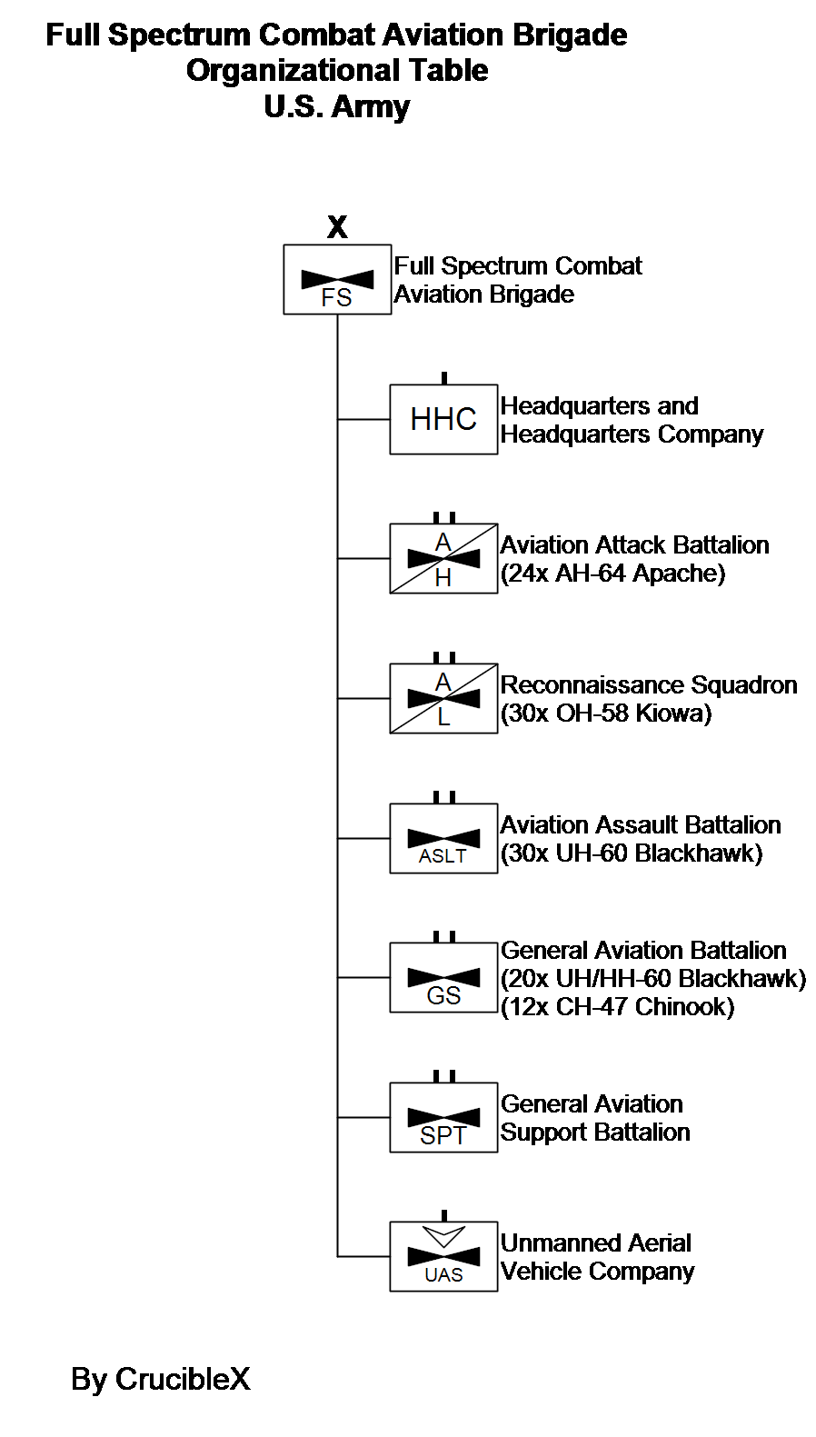 2010년부터 미국 육군은 중형 및 경형 항공여단을 다목적 여단으로 교체하기 시작했는데, 이를 전범위 전투항공여단(Full Spectrum Combat Aviation Brigadeeng)이라고 부른다. 궁극적인 목표는 현역에 8개의 전범위 전투항공여단과 4개의 중(重) 전투항공여단을 배치하고, 육군 예비군에 각각 6개와 2개의 전투항공여단을 배치하는 것이다. 4개 여단은 상시 배치가 가능해야 한다.