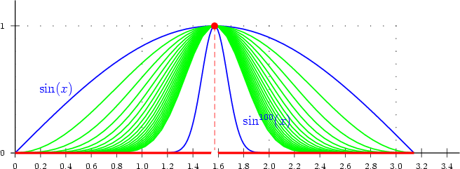 집합 X와 위상 공간 Y가 주어졌을 때, 함수들의 열 (f_n\colon X\to Y)_{n\in\mathbb N} 및 함수 f\colon X\to Y 에 대해, 임의의 x\in X 에서 점렬 (f_n(x))_{n\in\mathbb N}\subseteq Y 가 (Y 의 위상에 따라) 점 f(x)\in Y 로 수렴하면, 함수열 (f_n)_{n\in\mathbb N} 이 함수 f 로 '''점별 수렴'''한다고 한다. 이는 함수 집합 Y^X 위에 곱위상 을 부여했을 때 나타나는 수렴과 같다. 따라서 Y^X 위의 곱위상은 흔히 '''점별 수렴 위상'''이라고 불린다. 보다 일반적으로, 함수 집합 \mathcal F\subset Y^X 위의 점별 수렴 위상은 곱위상의 부분 공간 위상을 의미한다.연속 함수의 점별 극한은 반드시 연속적일 필요는 없다. 연속 함수 \sin^n(x) (녹색)는 불연속 함수(빨간색)로 점별 수렴한다. X 가 집합이고 Y 가 실수 또는 복소수 와 같은 위상 공간 이거나 거리 공간 일 때, 함수 \left(f_n\right) 의 수열 이 함수 f : X \to Y 로 점별 수렴한다는 것은, 정의역의 모든 점 x 에서 평가된 수열 f_n(x) 의 극한 이 f(x) 와 같다는 의미이다. 즉, 다음이 성립한다. :\forall x \in X. \lim_{n\to\infty} f_n(x) = f(x). 이때 함수 f 는 \left(f_n\right) 의 점별 극한 함수라고 한다. 이 정의는 망 f_\bull = \left(f_a\right)_{a \in A} 으로 쉽게 일반화된다. f_\bull 이 점별로 f 로 수렴한다는 것은, f(x) 가 f 의 정의역에 있는 각 점 x 에서 평가된 망 f_\bull(x) 의 유일한 집적점이라는 의미이며, 다음과 같이 표현한다. :\forall x \in X. \lim_{a\in A} f_a(x) = f(x). 상수 C 가 존재하여 \forall n,x,\;|f_n(x)|인 경우 '유계 점별 수렴'이라는 용어를 사용하기도 한다. 함수열 { *f**n* }이 *f*로 점별 수렴한다는 것은 정의역의 모든 점 *x*에 대해 다음이 성립한다는 것을 의미한다. :\lim_{n\rightarrow\infty}f_n(x)=f(x) 이는 다음과 같이 표기하기도 한다. :\lim_{n\rightarrow\infty}f_n=f\ \mbox{pointwise} 논리 기호로 표현하면 다음과 같다. :\forall x, \forall \epsilon >0, \exists N \in \mathbb N \ ; \ n \geqq N \Rightarrow |f_n (x)-f(x)| < \epsilon