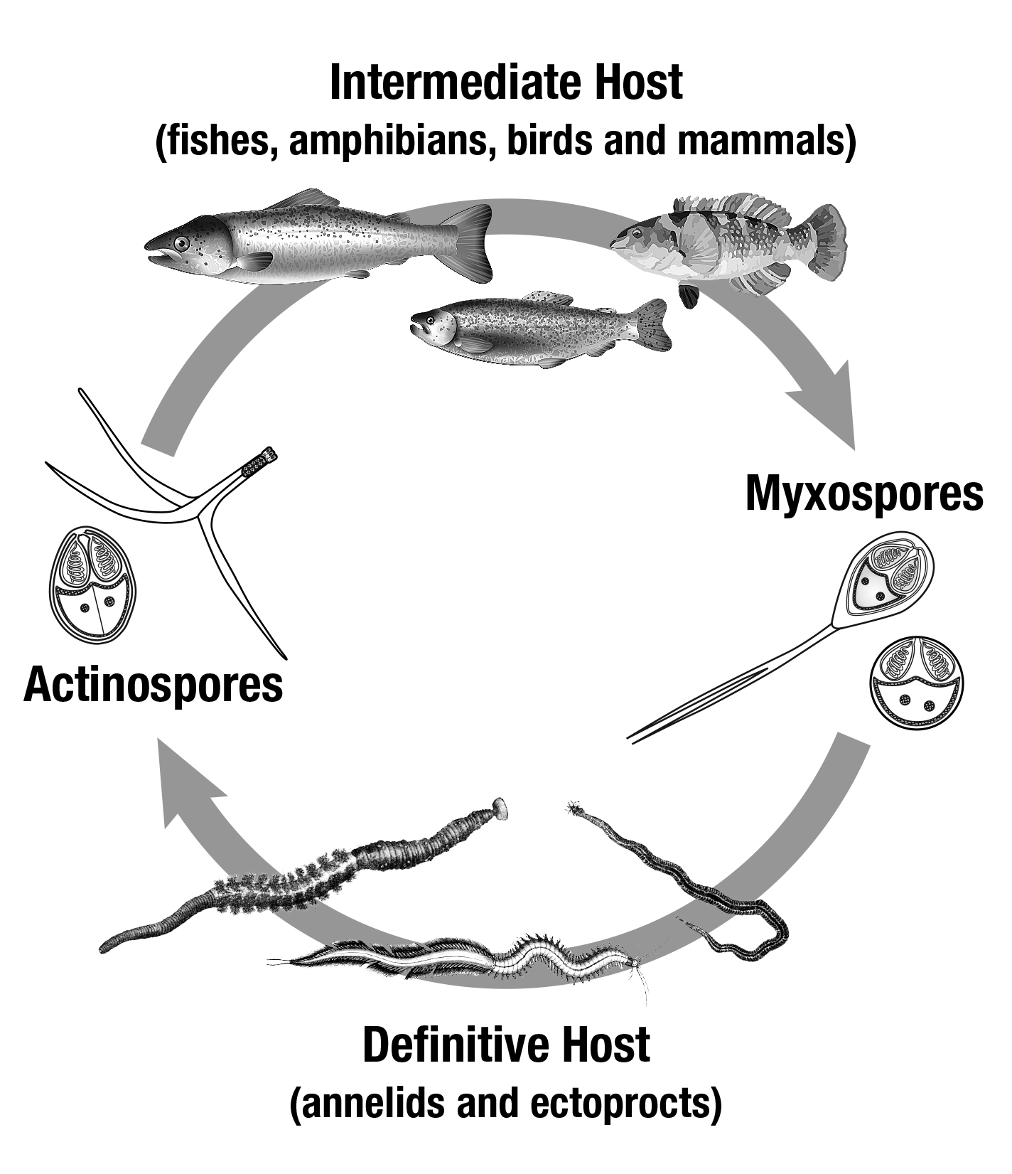 어류의 피부 또는 아가미와 접촉하면 포자체가 상피를 관통하고 점액포자 단계가 발달한다. 점액포자 영양체는 이차 세포가 모 세포 내에서 발달하는 세포 내 세포 상태가 특징이다. 전포자 발생 단계는 증식하여 신경계 또는 순환계를 통해 이동하여 포자 발생 단계로 발달한다. 최종 감염 부위에서 단포자 또는 이포자 가소체 또는 다포자 원형질 내에서 성숙한 포자를 생성한다.[14]