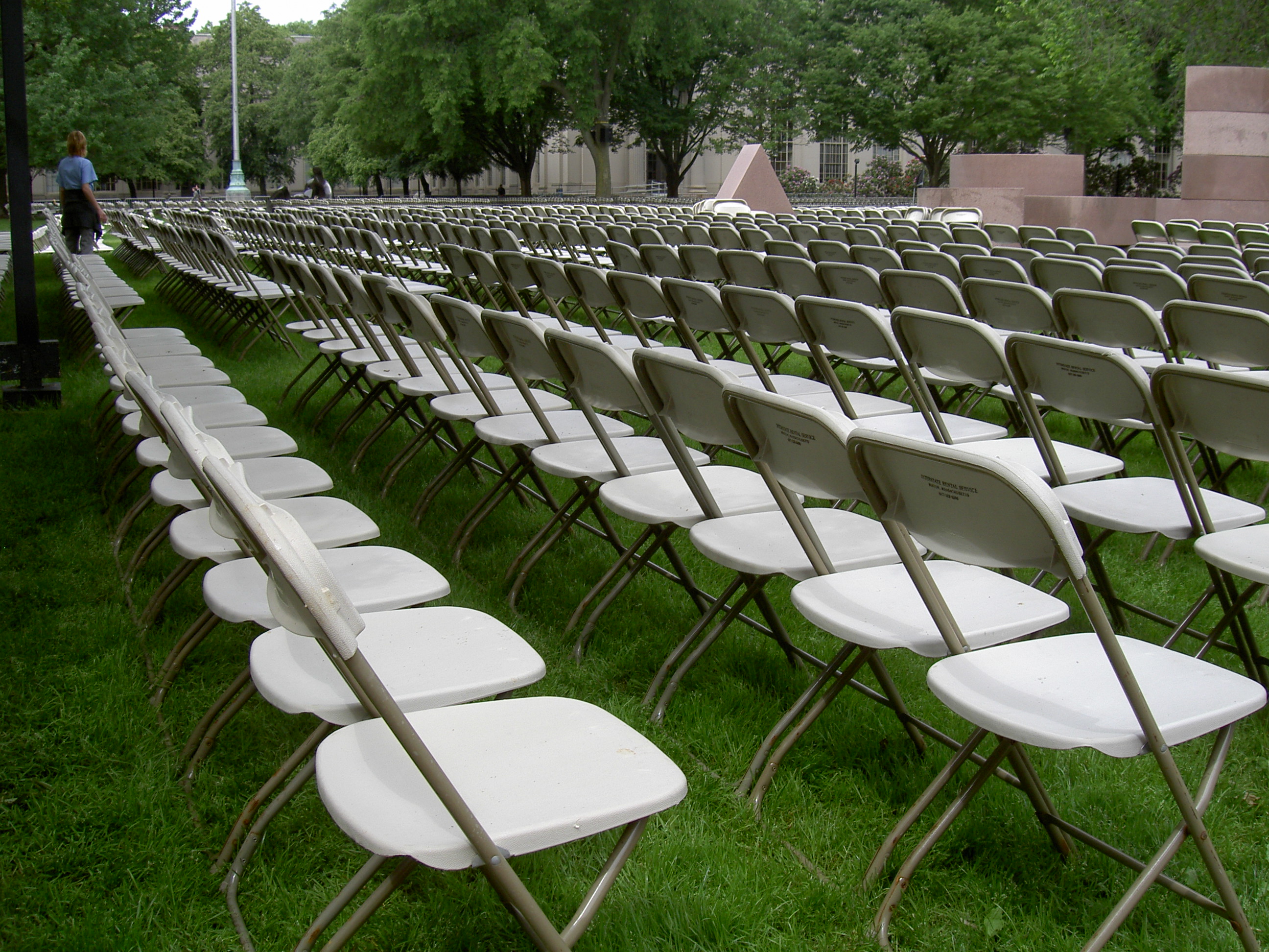 - 수천 명 규모의 인원을 수용하는 콘서트 회장 등에서는 접이식 파이프 의자의 반입, 설치, 철수만으로도 장시간이 소요되며, 콘서트 전후 밤에 아르바이트가 철야로 작업을 하는 경우도 있다.