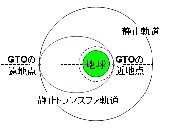 # GTO 진입: 적절한 시점에 로켓 엔진(주로 발사 로켓의 최상단)을 점화하여 속도를 높여, 원지점 고도를 정지 궤도 높이까지 올린다. 이 타원 궤도가 GTO이다.