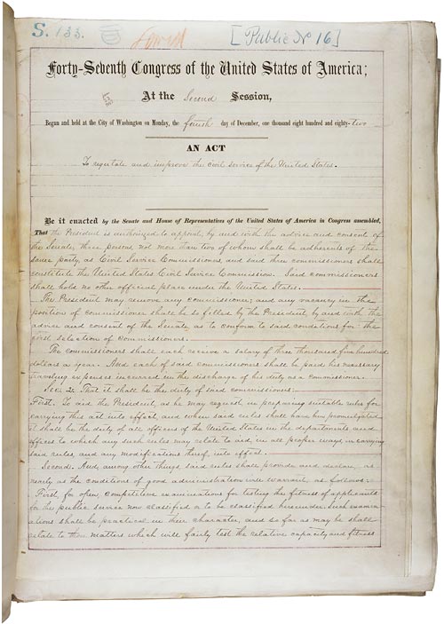 1883년 펜들턴 공무원 개혁법은 부패와 채용의 편파성, 그리고 부정부패 시스템과 싸우기 위해 미국 의회에서 통과되었다. 이 법은 능력에 기반한 채용을 옹호하고 공무원들을 정치적 영향으로부터 보호했다.[31][32]