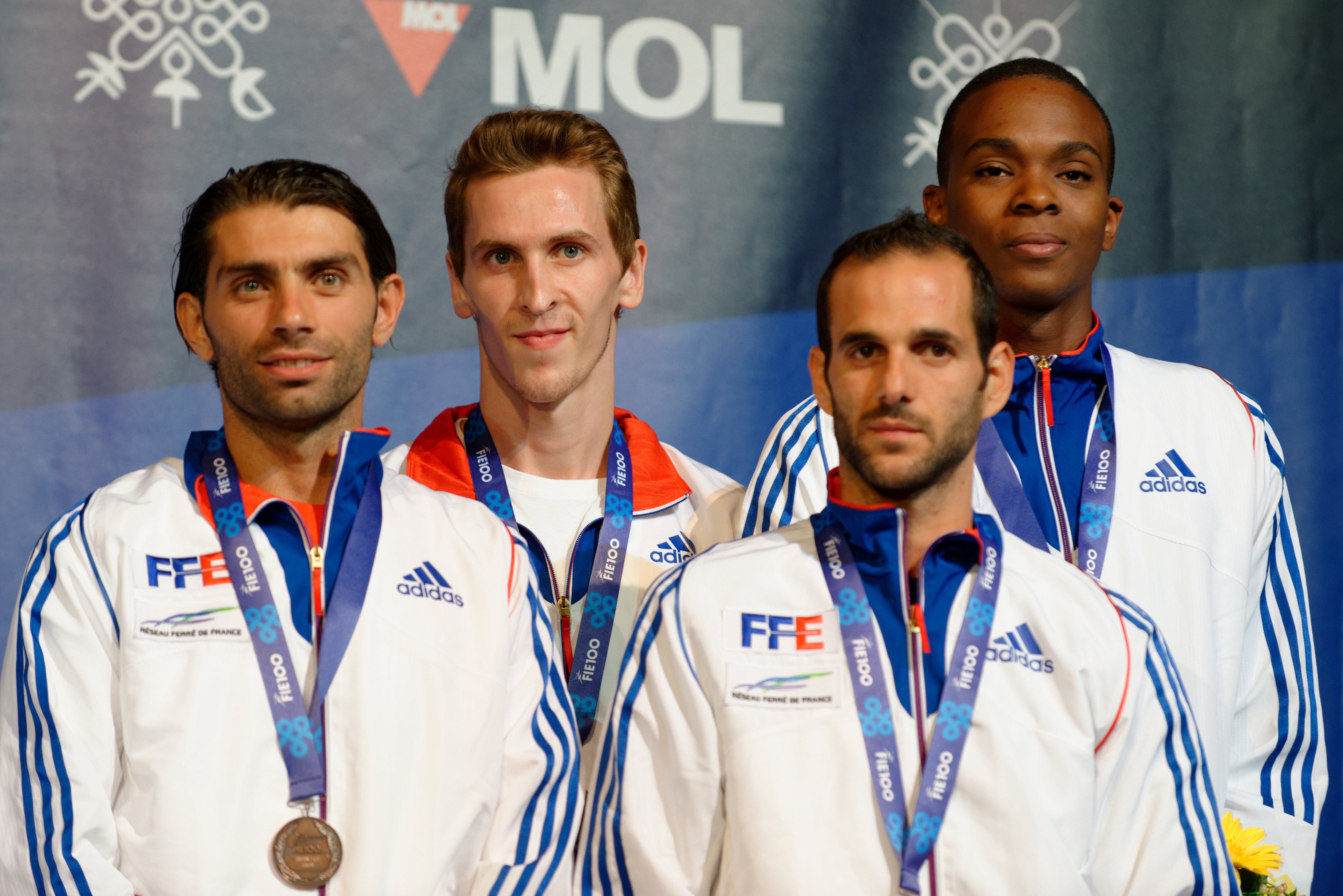 카도 (왼쪽에서 두 번째)와 2013 세계 펜싱 선수권 대회 시상대에서 팀원들