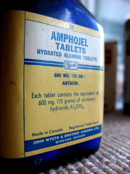 - 알루미늄 화합물: 수산화 알루미늄(알겔드레이트)이 대표적이다. 위 pH를 7 이상으로 높이지 않아 위산 과다 분비를 유발하지 않는 장점이 있다.[52] 하지만 알루미늄 이온이 위장관의 민무늬근 수축을 억제하여 연동운동을 늦추므로 변비를 유발할 수 있다.[53] 이러한 부작용을 줄이기 위해 수산화 마그네슘이나 탄산마그네슘과 함께 배합되기도 한다.
