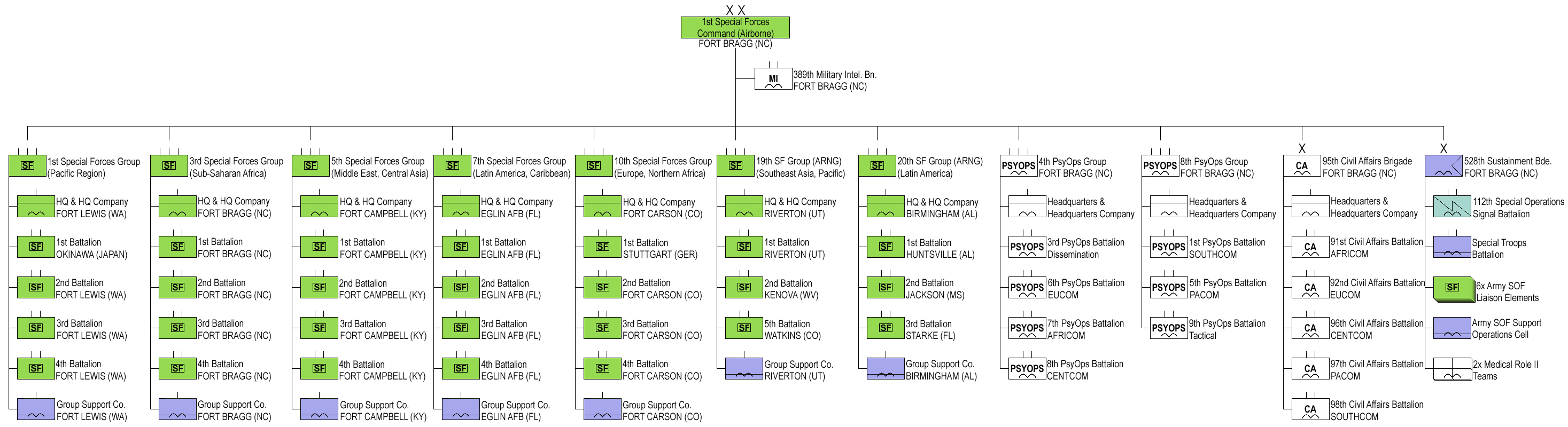 2014년 9월 30일, 그린베레와 심리작전단, 민사여단, 지원여단을 단일조직 안에 묶는다는 개념으로 사단급인 제1특전사령부가 창설되었다. 하지만, 재조직화 계획이 잡혀있지 않아 2015년 7월까지는 사령부의 기능이 제대로 작동하지 않는다고 관계자가 밝혔다.[28] 사령부에는 군인 22,845명, 민간인 126명의 인적자원 정원이 인가되었다.[29]