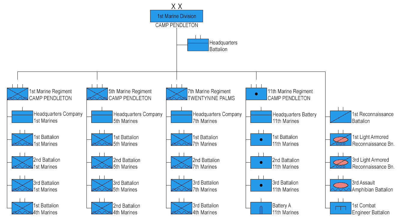 제1해병사단은 사단 본부와 4개의 보병 연대, 그리고 여러 지원 부대로 구성되어 있다.