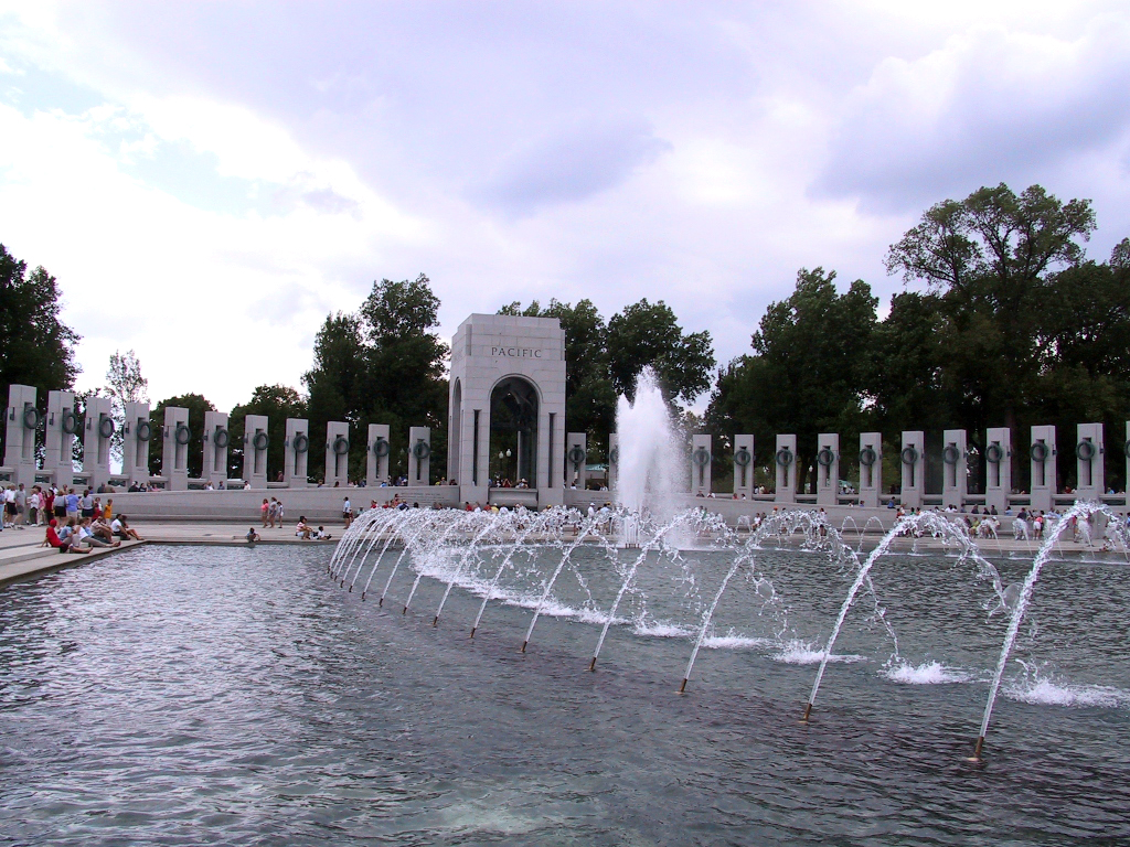 이 기념비는 높이 약 5.18m의 56개 화강암 기둥과 양쪽에 약 13.11m의 개선문이 있는 광장을 중심으로 반원으로 배열되어 있다. 각 기둥에는 1945년 당시 48개 미국 주와 워싱턴 D.C., 알래스카 준주와 하와이 준주, 필리핀 연방, 푸에르토리코, 괌, 아메리칸 사모아, 미국령 버진아일랜드의 이름이 새겨져 있다. 북쪽 개선문에는 "대서양"이, 남쪽 개선문에는 "태평양"이 새겨져 있다.[6]3. 3. 중앙 광장과 분수