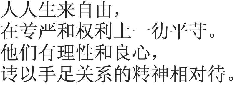 세계 인권 선언 제1조를 제2차 한자 간화 방안으로 표기한 예시는 다음과 같다. 비교를 위해 일반적인 간체자 및 번체자(정체자)로 같은 내용을 표기한 것도 함께 제시한다.