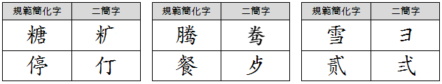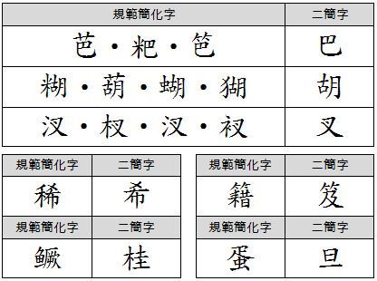 또한, 이 방법에 의해, '辺|biān중국어'(변)은 '道|dào중국어'(도)의 제2차 간화자, '雫|shizuku일본어'(나)는 '霞|xiá중국어'(하)의 제2차 간화자가 되었다.