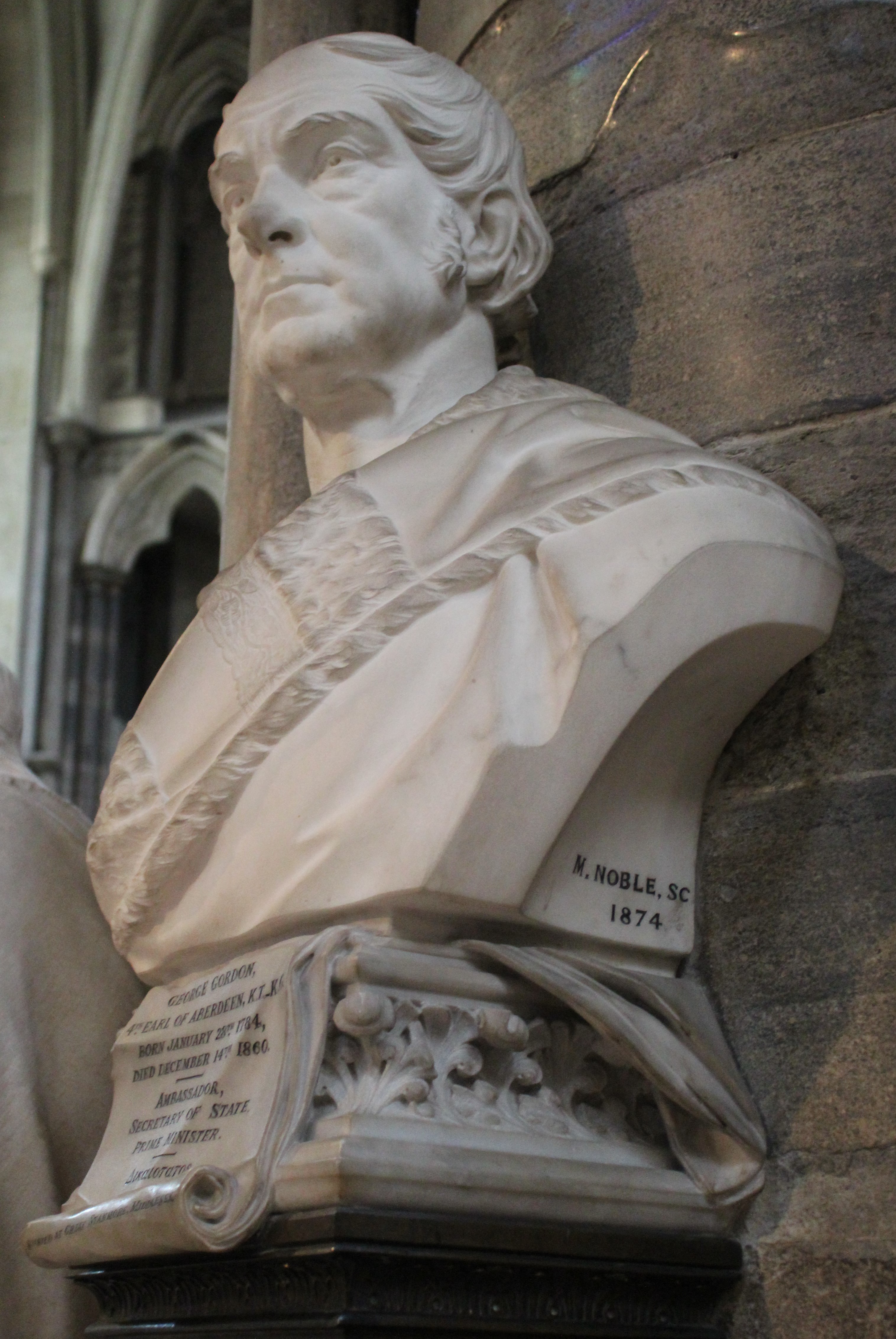 제4대 애버딘 백작 조지 해밀턴고든은 1784년에 태어나 1860년에 사망한 영국의 정치인이자 외교관이다. 그는 1805년 스코틀랜드 대표 귀족으로 귀족원에 입성했고, 1812년 오스트리아 주재 특명 전권 대사로 임명되어 테플리츠 조약과 파리 조약 협상에 참여했다. 1828년 웰링턴 내각에서 외무 장관을 역임했고, 1841년부터 1846년까지 필 내각에서 외무 장관으로 재직하며 미국과의 관계 개선, 아편 전쟁 종결 등에 기여했다. 1852년 총리가 되어 크림 전쟁을 이끌었으나, 전쟁의 장기화로 지지를 잃고 사임했다. 그는 외교적 수완을 발휘했지만, 크림 전쟁에서의 실패로 평판이 훼손되었다.