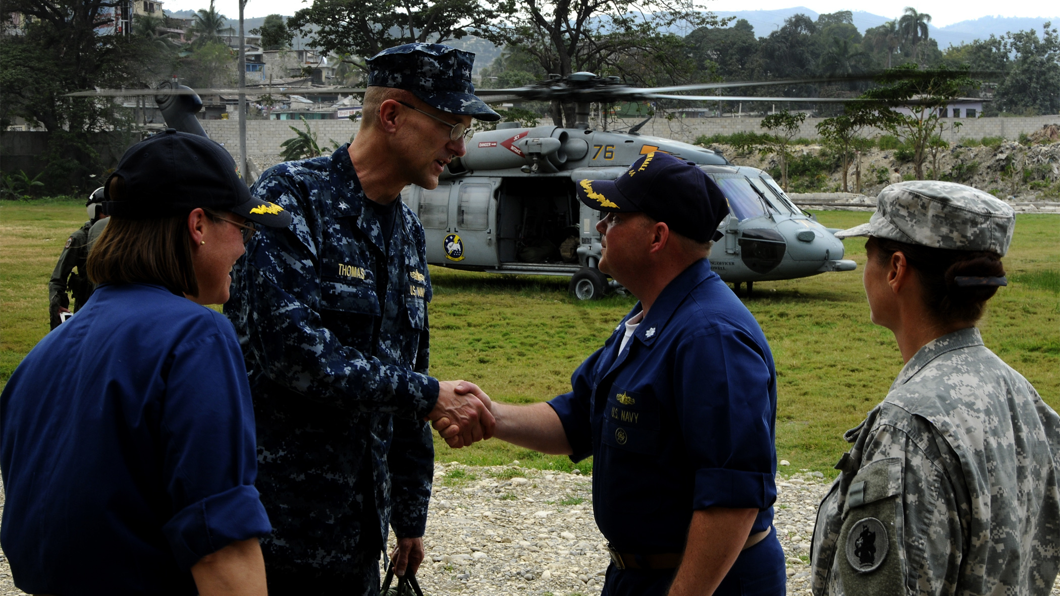 제41 기동전대 사령관 토마스 해군 소장이 2010년 2월 5일 아이티에서 USS ''건스톤 홀'' 함장과 악수하고 있다. 제4함대 소속 부대들은 지진 발생 후 아이티를 지원하기 위해 배치되었다.