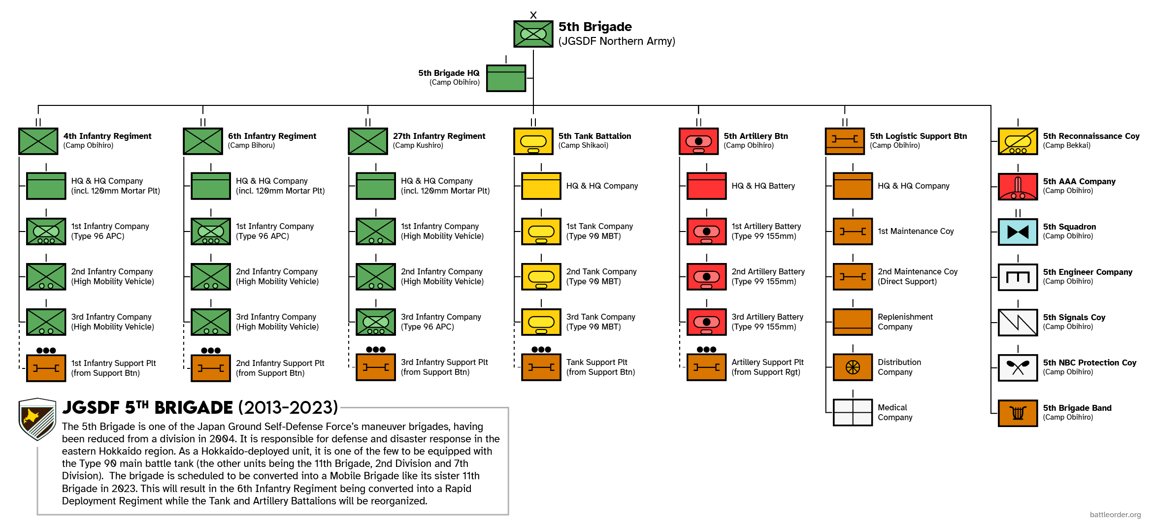 오비히로 주둔지에는 제5여단 사령부 및 제4보통과연대, 제5특과대, 제5후방지원대, 제5시설대, 제5비행대, 제5통신대, 제5고사특과대, 제5화학방호대, 제5정보대, 제5음악대가 주둔하고 있다.[1] 비호로 주둔지에는 제6기동연대가,[1] 구시로 주둔지에는 제27보통과연대(일부)가 주둔한다. 시카오이 주둔지에는 제5전차대와 제5시설대(일부)가, 벳카이 주둔지에는 제5정찰대와 제27보통과연대(일부)가 주둔하고 있다.