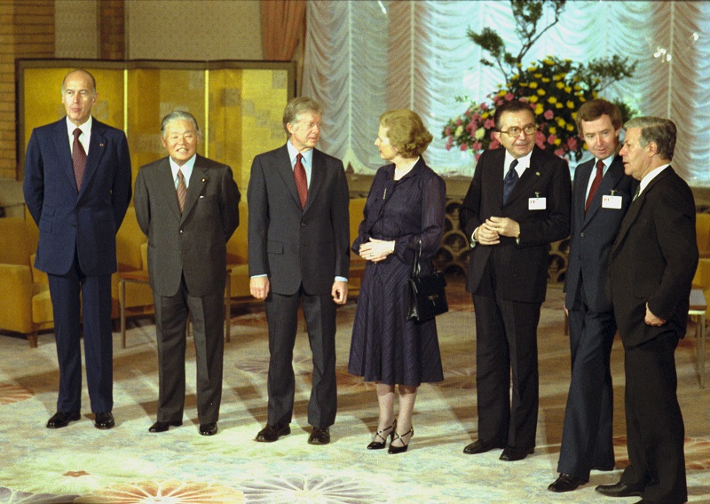 경제 정상회의에 참석한 세계 지도자들의 단체 사진 (왼쪽부터): 프랑스 (발레리 지스카르 데스탱), 일본 (오히라 마사요시), 미국 (지미 카터), 영국 (마거릿 대처), 이탈리아 (줄리오 안드레오티), 캐나다 (조 클라크), 서독 (헬무트 슈미트)