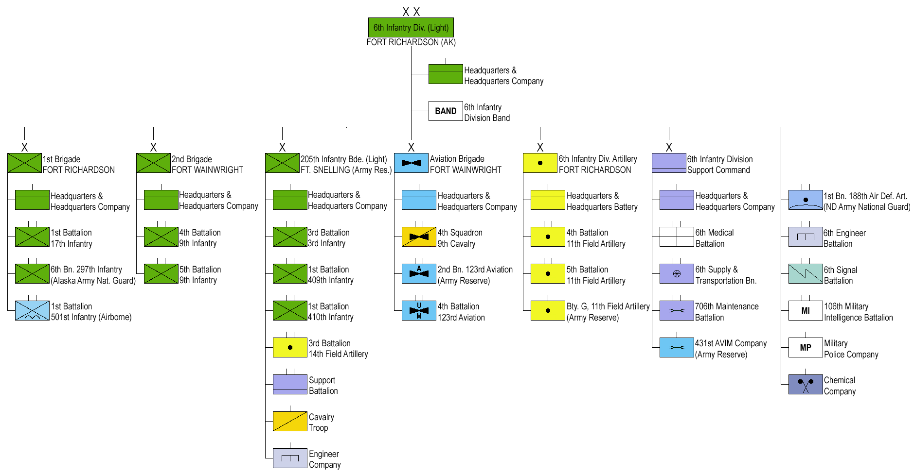 냉전 말기, 제6보병사단은 경보병사단으로 알래스카에 주둔하며 북극 작전을 담당했다. 제1여단은 포트 리처드슨에, 제2여단은 포트 웨인라이트에 주둔했으며, 미네소타 방위군 소속 제205경보병여단이 사단에 배속되었다. 또한, 항공여단, 포병대, 지원사령부, 그리고 방공, 공병, 군사정보, 헌병 등의 부대가 사단을 지원했다. 1988년에는 공수 대대가, 1990년에는 제17보병연대 1대대가 시나이 반도에 배치되기도 했다.