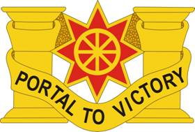 휘장은 황금색 테두리 안의 벽돌색 방패 모양이다. 중앙 지점에서 7개의 황금색 광선이 뻗어 나오며, 그 위에 파란색 체스 룩이 놓여 있다. 방패 중앙에서 뻗어 나오는 광선은 인원 및 화물의 수령과 분산을 상징하며, 7개의 광선은 부대의 번호를 나타낸다. 체스 말인 '룩'은 성, 즉 중세 시대의 전투원과 물자 보관소를 의미하며, 페르시아어 '로크'(병사)에서 유래했다. 이는 부대에서 한 수송 방식에서 다른 수송 방식으로 이전되는 군대와 장비를 상징한다. 보병의 색상인 파란색은 적대적인 지상 공격에 맞서 스스로를 방어하는 부대의 능력을 의미한다. 벽돌색과 황금색은 수송 병과를 나타낸다.