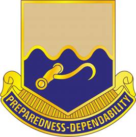 부대 휘장은 1971년 9월 21일에 승인되었다. 휘장은 금색 반태양 아래 11개의 금색 광선이 뻗어 나오는 모습이다. 그 아래에는 벽돌색 테두리가 있는 8개의 살을 가진 금색 선박 조타 장치가 자리 잡고 있으며, 중앙에는 위는 붉은색, 아래는 파란색인 태극 문양이 그려져 있다. 조타 장치 위쪽에는 파란색 두루마리가 걸쳐 있고, 금색 글씨로 부대의 모토인 "RESOLUTE"가 새겨져 있다.휘장의 각 요소는 상징적인 의미를 담고 있다. 11개의 햇살은 부대가 제2차 세계 대전 당시 유럽 전선에서 복무한 것과 한국 전쟁에서 10개의 작전에 참전한 것을 의미한다. 중앙의 태극 문양은 부대의 한국 전쟁 참전과 두 차례의 대한민국 대통령 부대 표창 수상을 나타낸다. 선박 조타 장치와 파란색 두루마리는 수역 터미널 운영 부대를 지휘하는 임무를 상징한다. 휘장에 사용된 벽돌색과 금색(노란색)은 수송 병과를 상징하는 색이다.