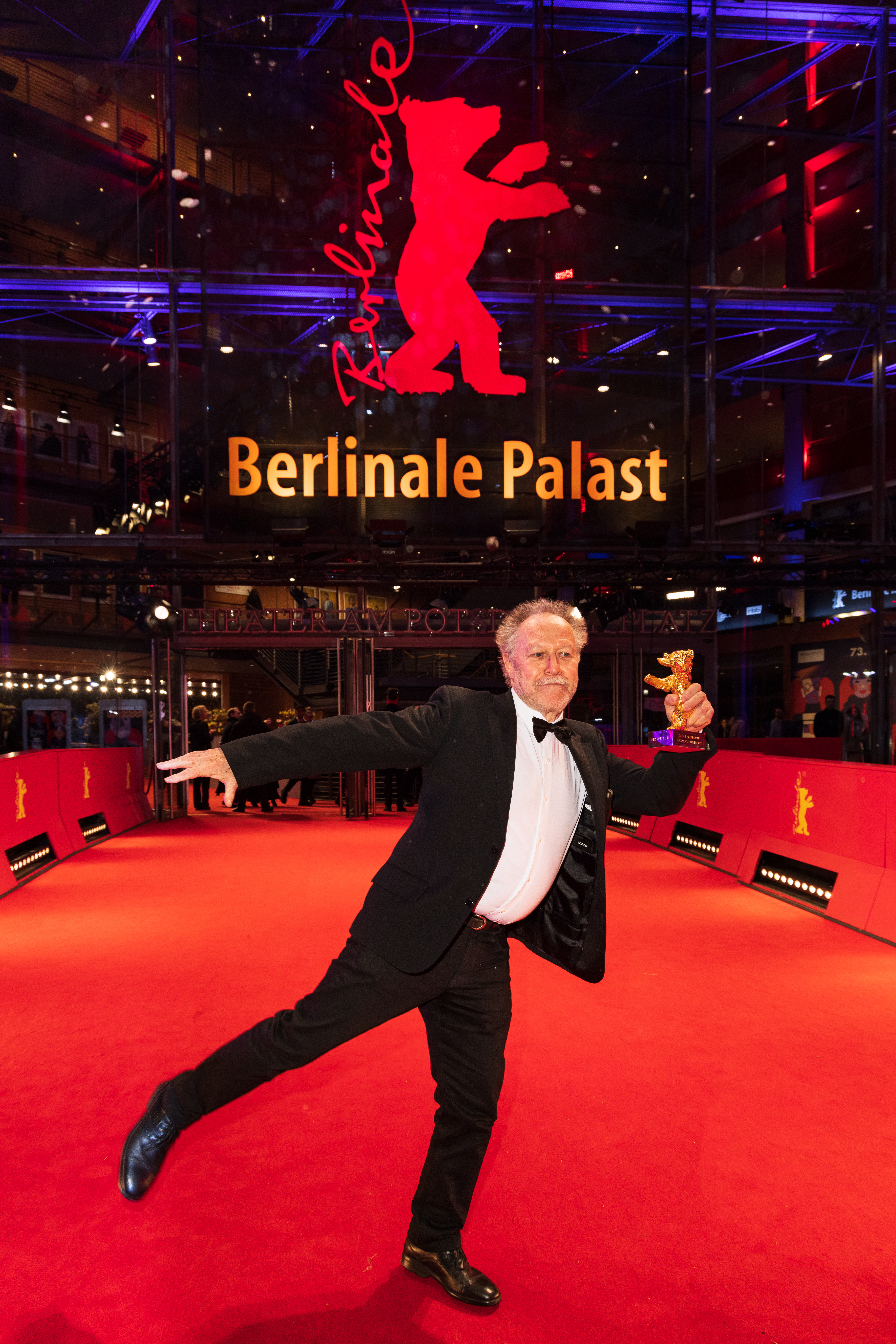 황금곰상을 들고 베를리날레 팔라스트 앞에서 레드 카펫을 밟고 있는 니콜라 필리베르