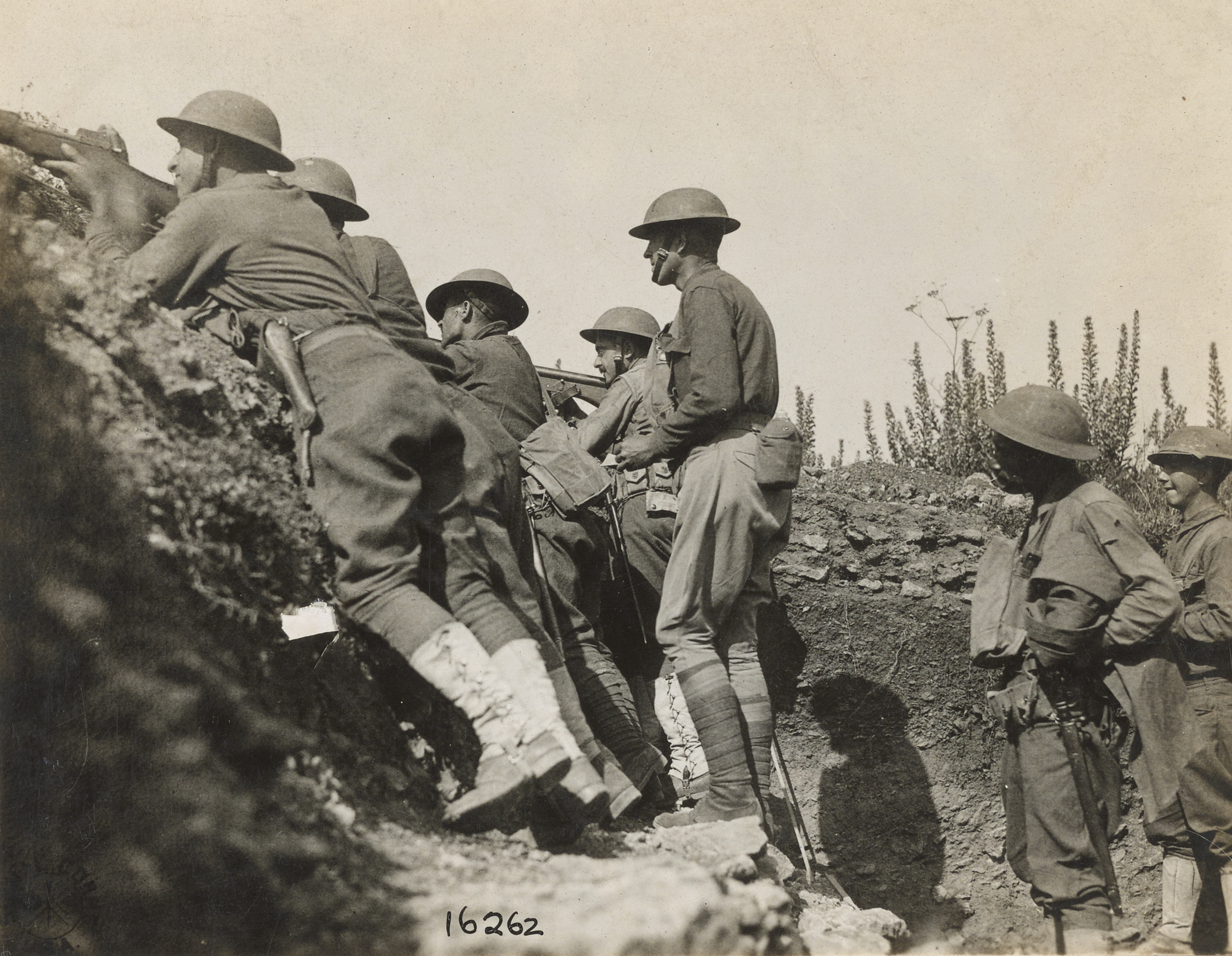 도우보이 제82사단 제328보병연대 B중대 병사들이 1918년 7월 1일 프랑스 전선 참호에서 복무하고 있다