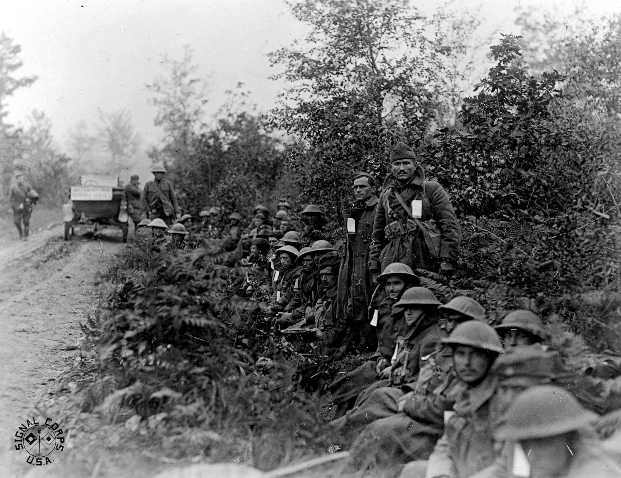 1918년 10월 프랑스 라뱅 오 피에르(문자 그대로 "돌 협곡")로 가는 길에 있는 제82사단 병사들.