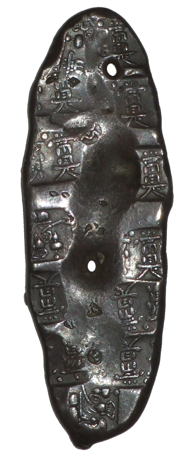 하카타 어공용 정은(博多御公用丁銀) | "어공용"(御公用) "분로쿠 2 나카야마 요자에몬"(文禄二中山与左衛門) 극인이 찍혀 있다. 분로쿠의 역 때 도요토미 히데요시가 주조한 것으로 알려져 있다. |