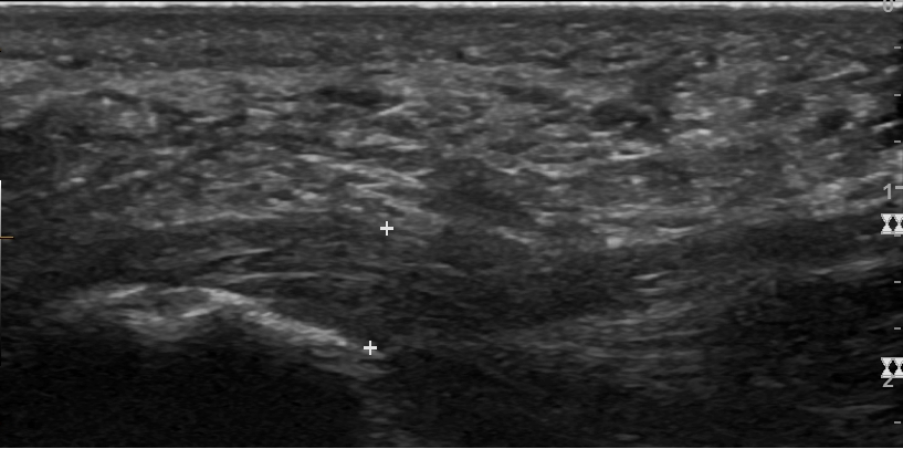 족저 근막은 세 개의 다발로 이루어져 있는데, 중앙 다발이 4mm로 가장 두껍고, 가쪽 다발은 2mm, 안쪽 다발은 1mm 미만이다.[17] 족저 근막의 두께가 두꺼워질수록 족저 근막염 발생 가능성이 높아진다. 초음파에서 4.5mm 이상, MRI에서 4mm 이상 두꺼워지면 진단에 도움이 된다.[18] 하지만 족저 근막 비후와 같은 다른 영상 소견은 족저 근막염 진단에 제한적인 유용성을 가진다.[13]