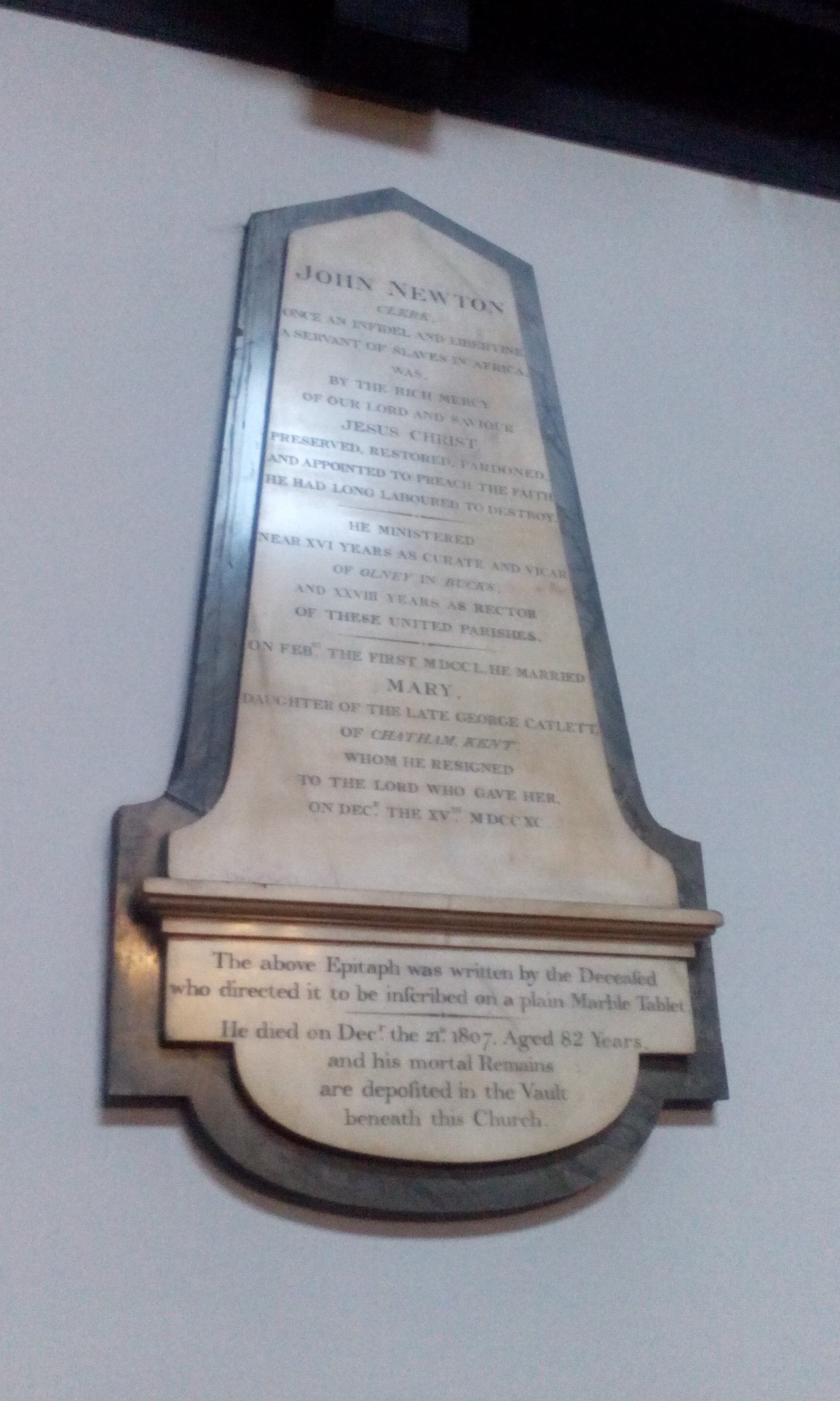 - 존 뉴턴이 처음 런던에 묻혔을 때, 그의 자작 묘비명이 새겨진 뉴턴 기념비가 세인트 메리 울노스 교회 벽에 설치되었다. 비석 하단에는 "위의 묘비명은 고인이 작성했으며, 평범한 대리석 판에 새길 것을 지시했다. 그는 1807년 12월 21일에 사망했다. 향년 82세, 그의 유해는 이 교회 지하 묘지에 안치되어 있다."라는 글이 새겨져 있다.
